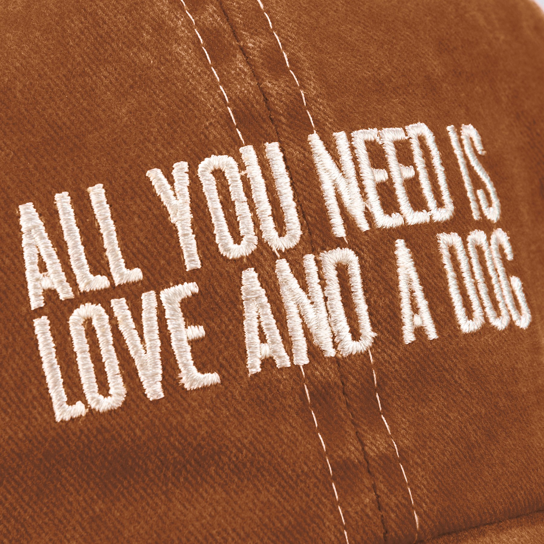 A cotton baseball cap featuring an embroidered "All You Need Is Love And A Dog" sentiment, burnt orange base, and adjustable brass closure on the back. Our All You Need Is Love And A Dog hat is one size fits most. Hand-wash only.