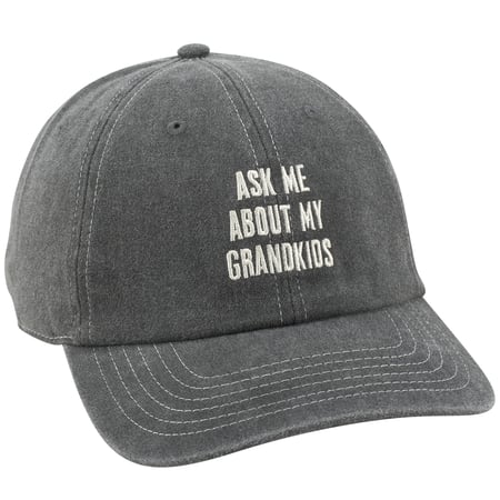 A stonewashed black baseball cap from our Box Sign Style Collection displaying a fun grandparent themed sentiment in a classic box sign style that reads "Ask Me About My Grandkids." This funny grandparent hat features a fully embroidered design for added detail as well as cream thread accents. Our Ask Me About My Grandparents baseball cap is one size fits most with an adjustable metal buckle to create the perfect fit. Hand wash only. A fun grandparent gift perfect for an everyday accessory.
