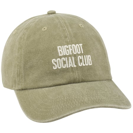 A stonewashed tan baseball cap from our Lake & Cabin Collection displaying a fun bigfoot themed sentiment in a classic box sign style that reads "Bigfoot Social Club." This bigfoot hat features a fully embroidered design for added detail. Our Bigfoot Social Club baseball cap is one size fits most with an adjustable metal buckle to create the perfect fit. Hand wash only. A fun bigfoot themed gift perfect for an outdoor accessory.