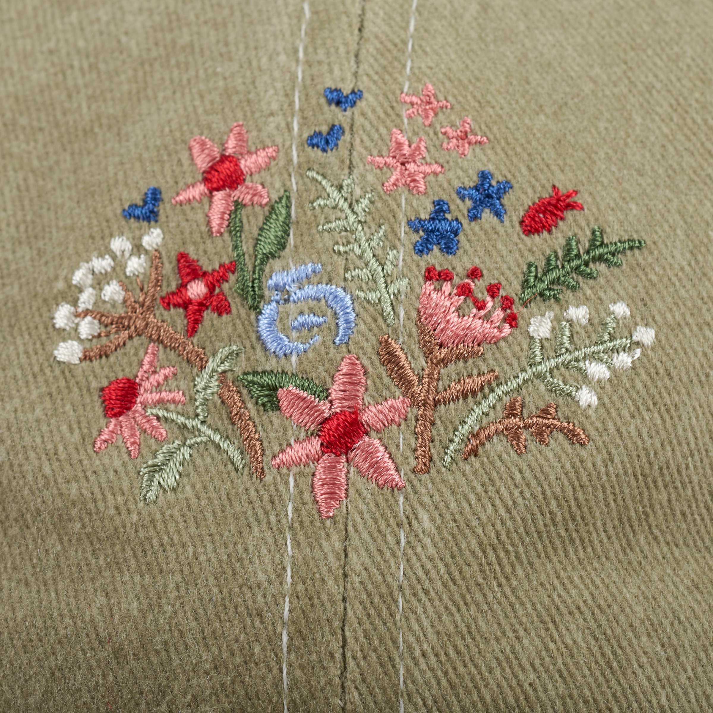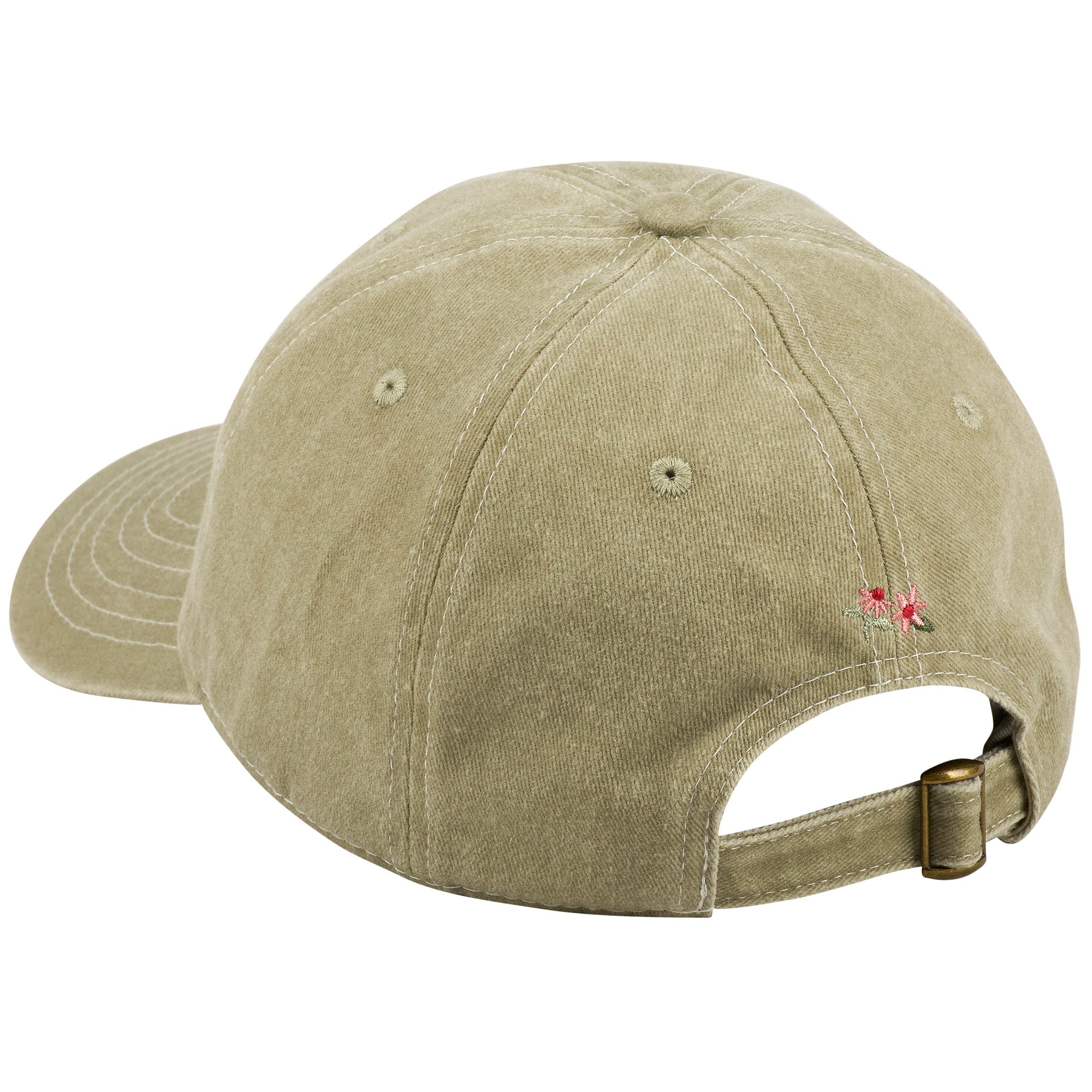 A stonewashed tan baseball cap from our Cottagecore Collection displaying embroidered designs of various blossoms on the front with a coordinating flower designs on the back. Embroidered blossom designs are replicated from original hand illustrated art. Our Blossoms baseball cap is one size fits most with an adjustable metal buckle to create the perfect fit. Hand wash only. A charming nature themed accessory perfect for everyday style and great for gifting.