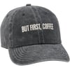A cotton baseball cap with an adjustable brass closure on the back. Features "But First, Coffee" sentiment embroidered in cream onto charcoal base. One size fits most. Hand-wash only.