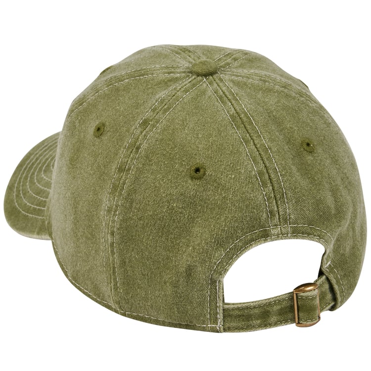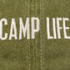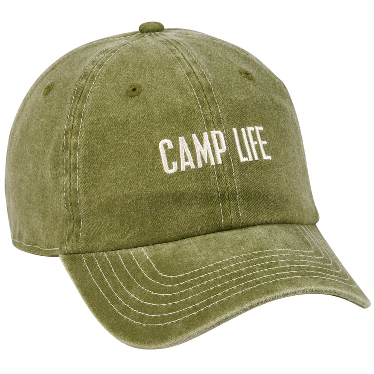 A stonewashed green baseball cap from our Lake & Cabin Collection displaying a fun camping inspired sentiment in a box sign style that reads "Camp Life" with cream thread accents. Camping hat features fully embroidered sentiment for added detail. Our Camp Life baseball cap is one size fits most with an adjustable metal buckle to create the perfect fit. Hand wash only. A fun camping-themed gift perfect for a outdoor activities.