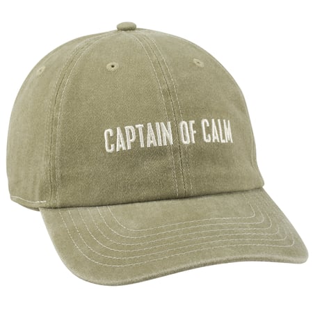 A stonewashed tan baseball cap from our Box Sign Style Collection displaying a fun sentiment in a classic box sign style that reads "Captain Of Calm." This casual hat features a fully embroidered design for added detail. Our Captain Of Calm baseball cap is one size fits most with an adjustable metal buckle to create the perfect fit. Hand wash only. A fun gift perfect for an everyday accessory.