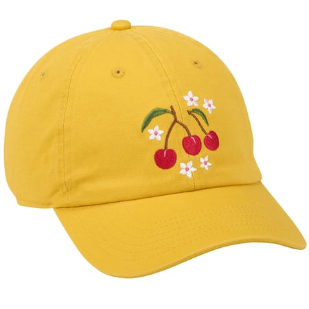 A yellow baseball cap from our Inspiration & Blooms Collection displaying embroidered designs of wild cherries and flowers on the front with a coordinating cherry and flower design on the back. Embroidered cherry and flower designs are replicated from original hand illustrated art. Our Cherries baseball cap is one size fits most with an adjustable metal buckle to create the perfect fit. Hand wash only. An charming cherry themed accessory perfect for everyday style and great for gifting.