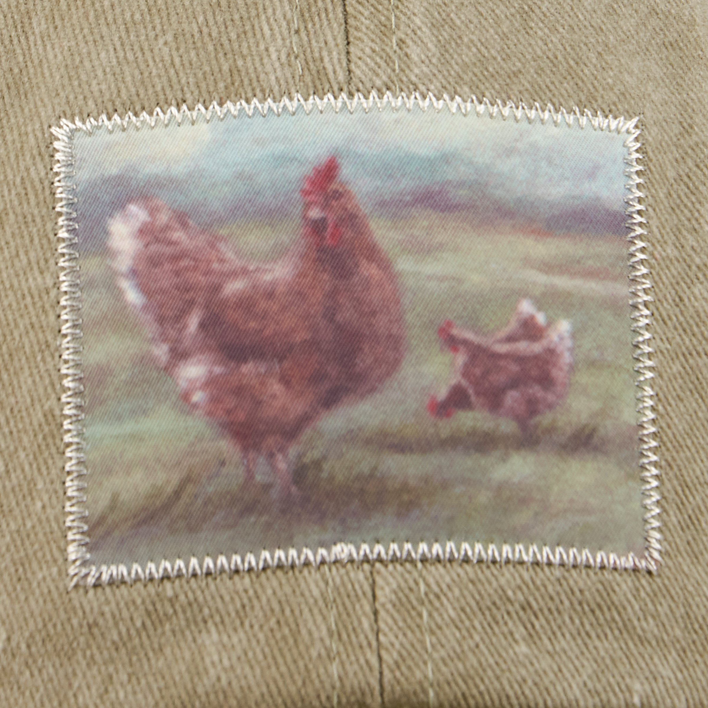 A stonewashed tan baseball cap from ourĀ Farmhouse Collection featuring a stitched art panel on the front displaying a farm inspired design of chickens in a field. Design is replicated from original artwork painted onto burlap canvas, giving the art a unique depth and texture. Art panel features embroidered border for added detail. Our Chicken hat is one size fits most with an adjustable buckle closure to create the perfect fit. A farm-themed baseball cap perfect for an everyday accessory. Hand wash only.