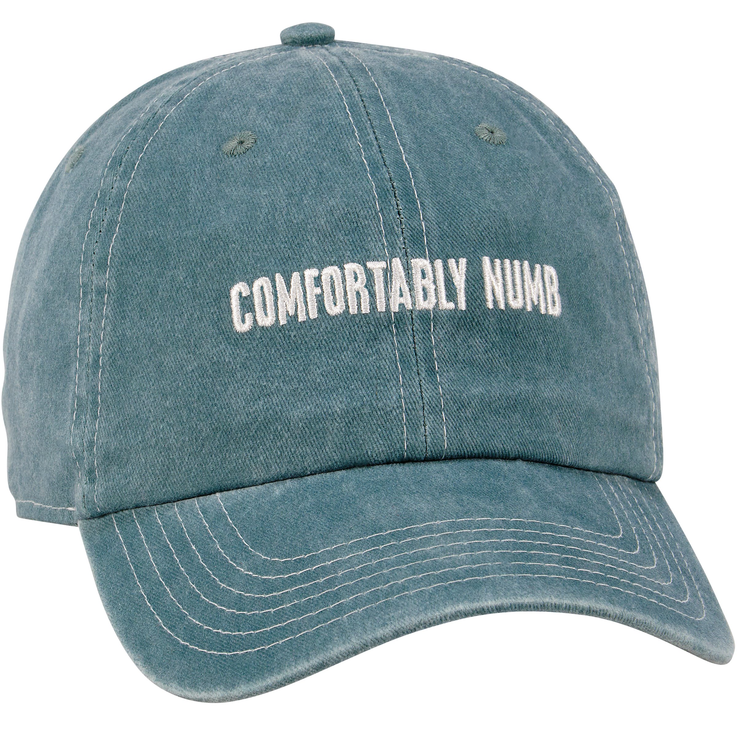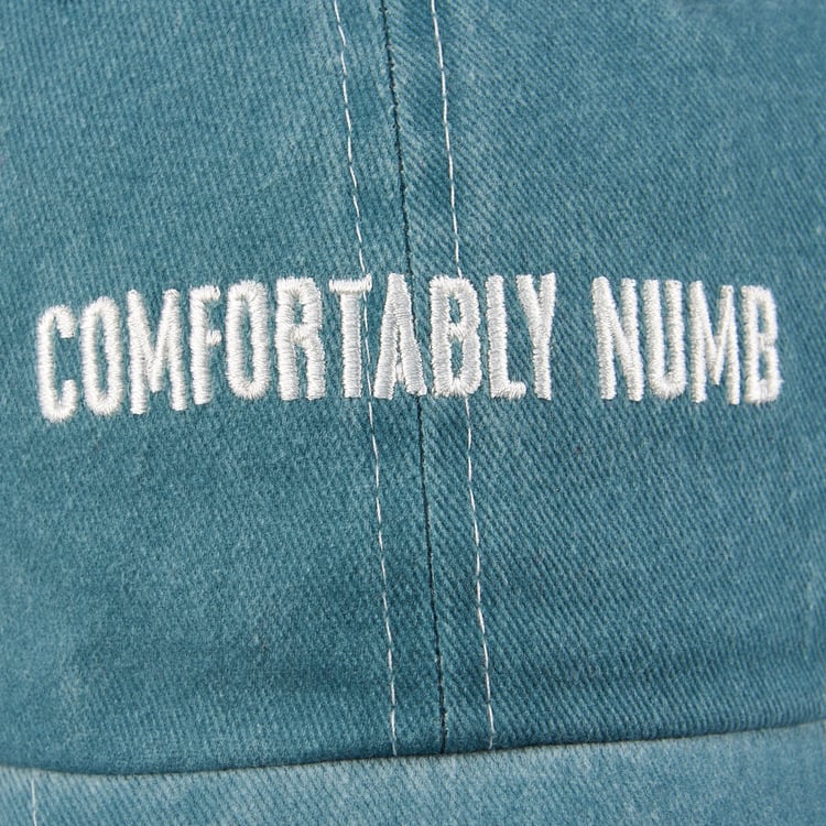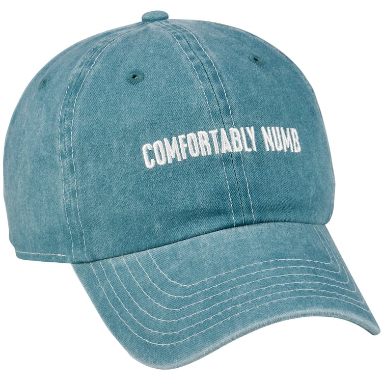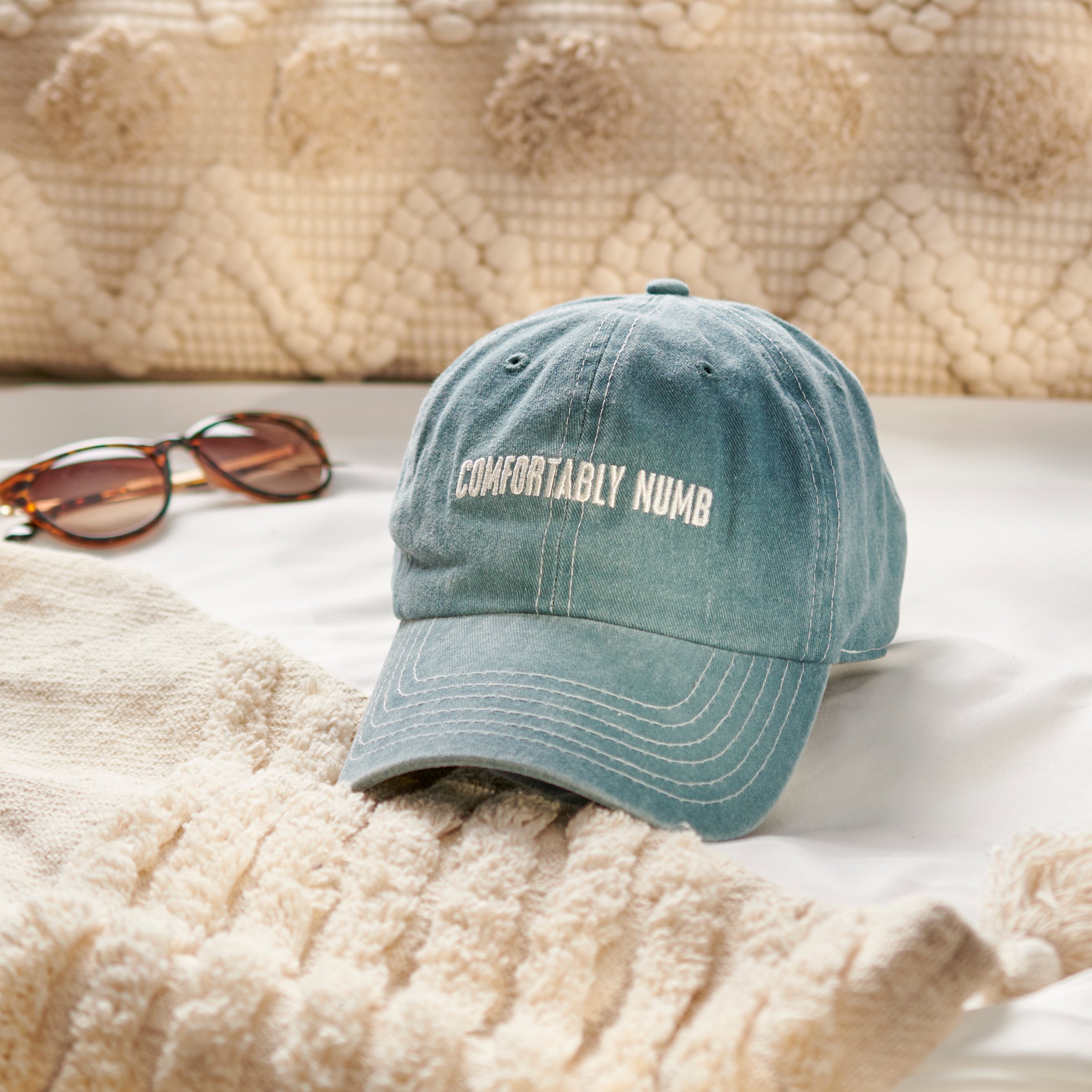 A stonewashed ocean blue baseball cap from our Beach Collection displaying a box sign style sentiment that reads "Comfortably Numb." Cap features embroidered sentiment for added detail. Our Comfortably Numb baseball cap is one size fits most with an adjustable buckle closure to create the perfect fit. A fun beach day accessory perfect for everyday use. Hand wash only.