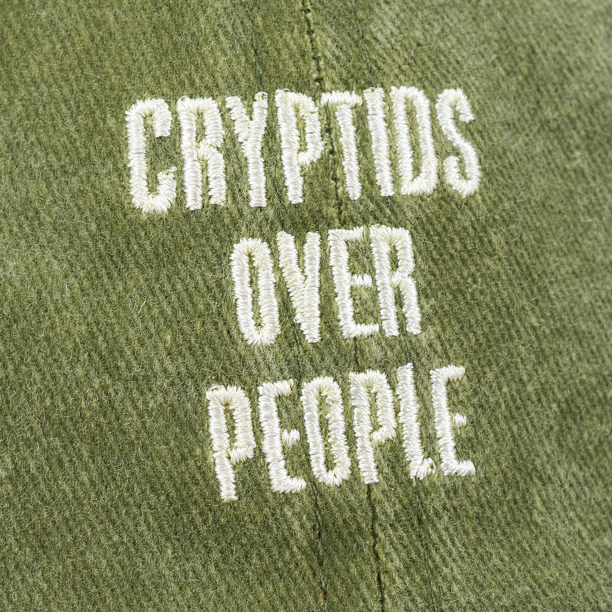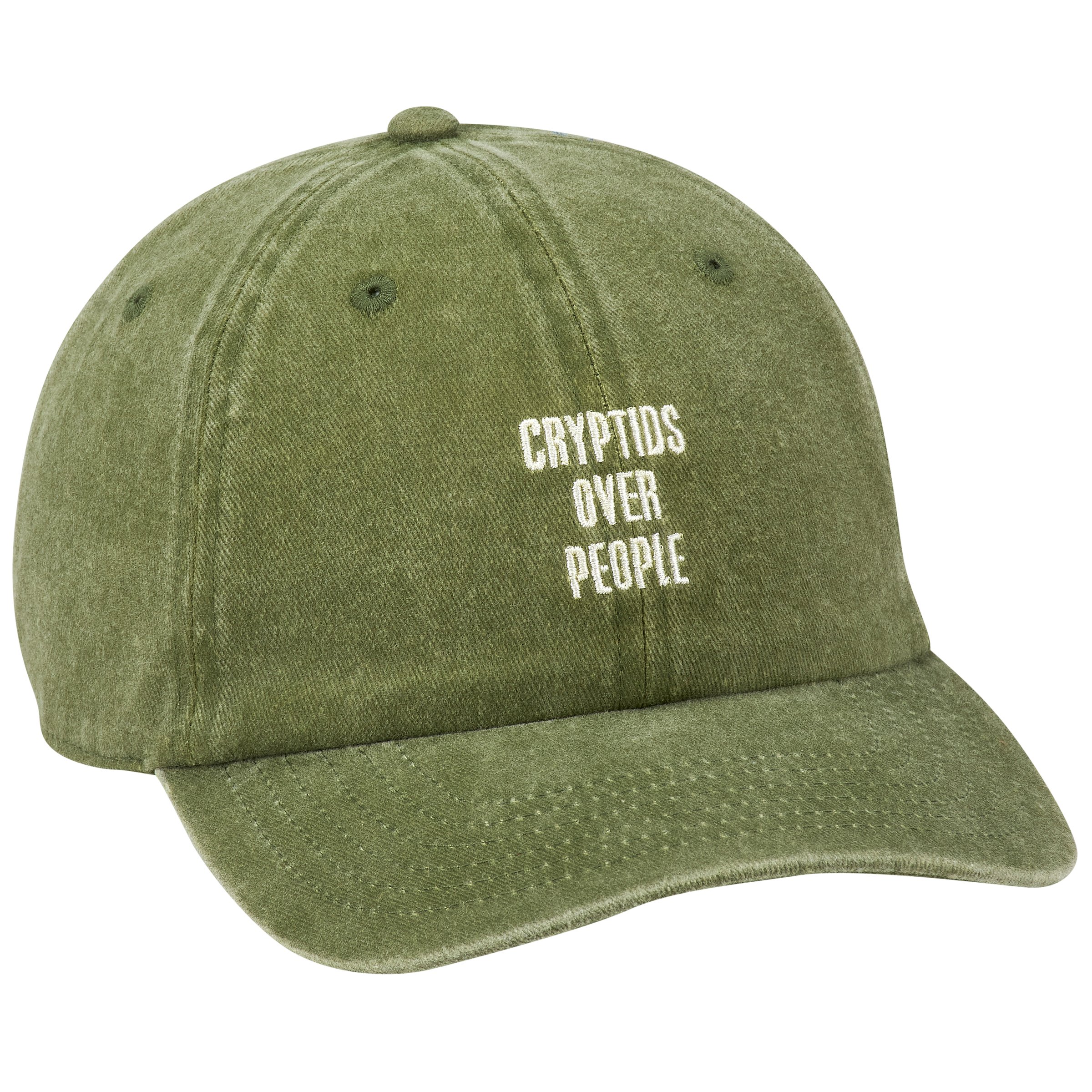 A stonewashed green baseball cap from our Lake & Cabin Collection displaying a fun cryptid themed sentiment in a classic box sign style that reads "Cryptids Over People." This cryptid hat features a fully embroidered design for added detail. Our Cryptids Over People baseball cap is one size fits most with an adjustable metal buckle to create the perfect fit. Hand wash only. A fun cryptid themed gift perfect for an outdoor accessory.