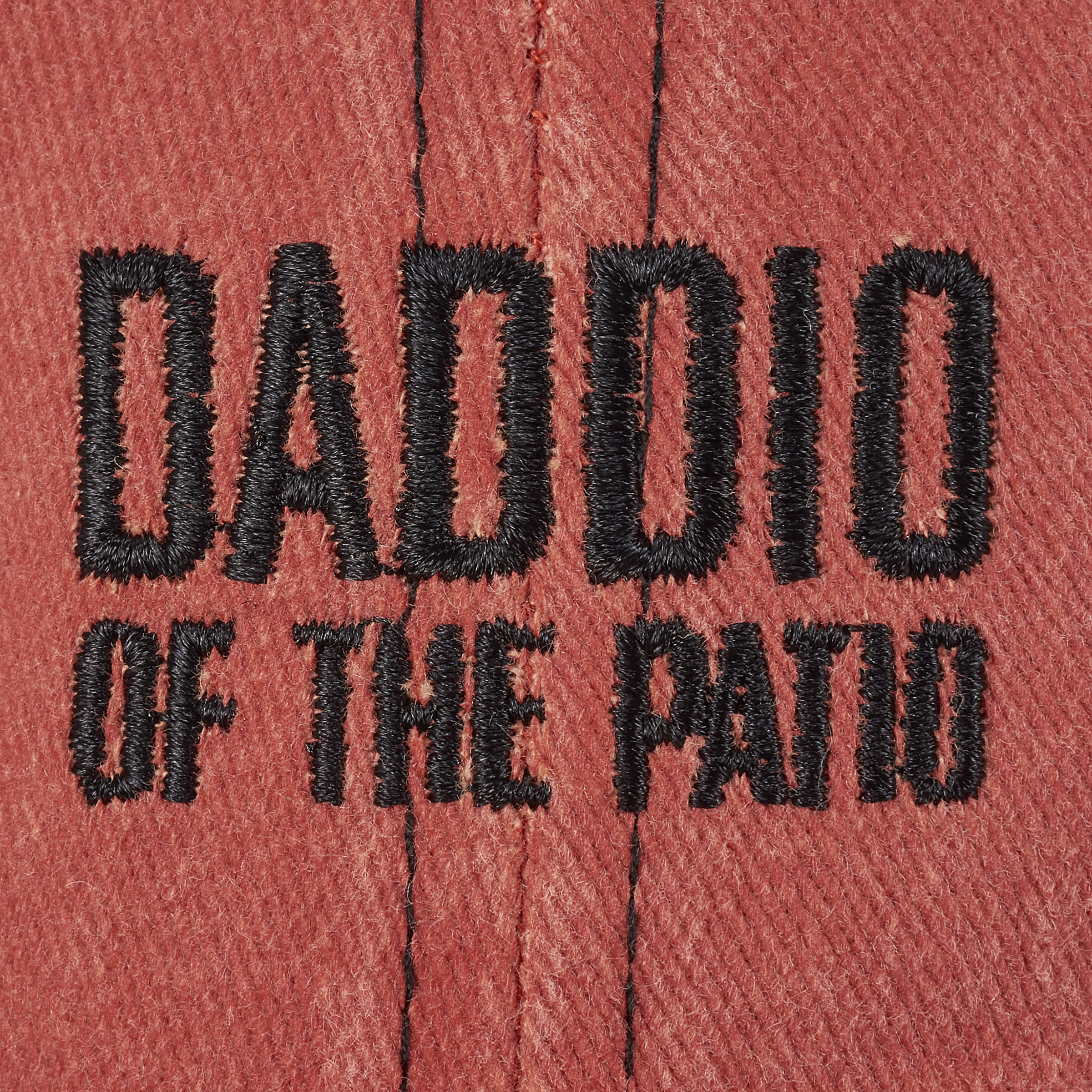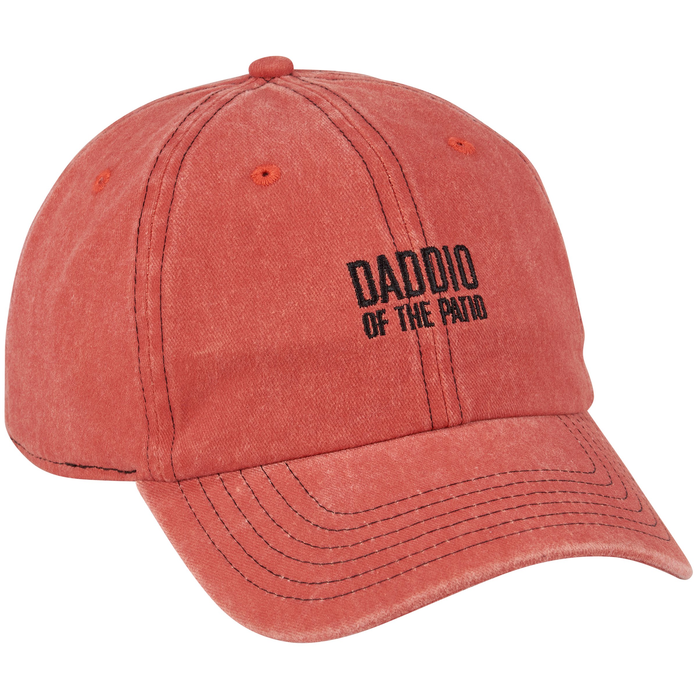 A stonewashed red baseball cap from our Father's Day Collection displaying a fun dad inspired sentiment in a box sign style that reads "Daddio Of The Patio" with black thread accents. Dad hat features fully embroidered sentiment for added detail. Our Daddio baseball cap is one size fits most with an adjustable metal buckle to create the perfect fit. Hand wash only. A fun Father's Day gift perfect for an everyday accessory.