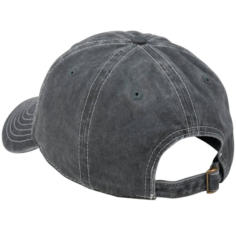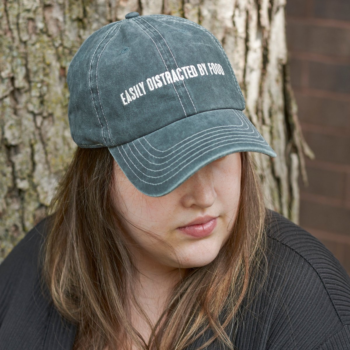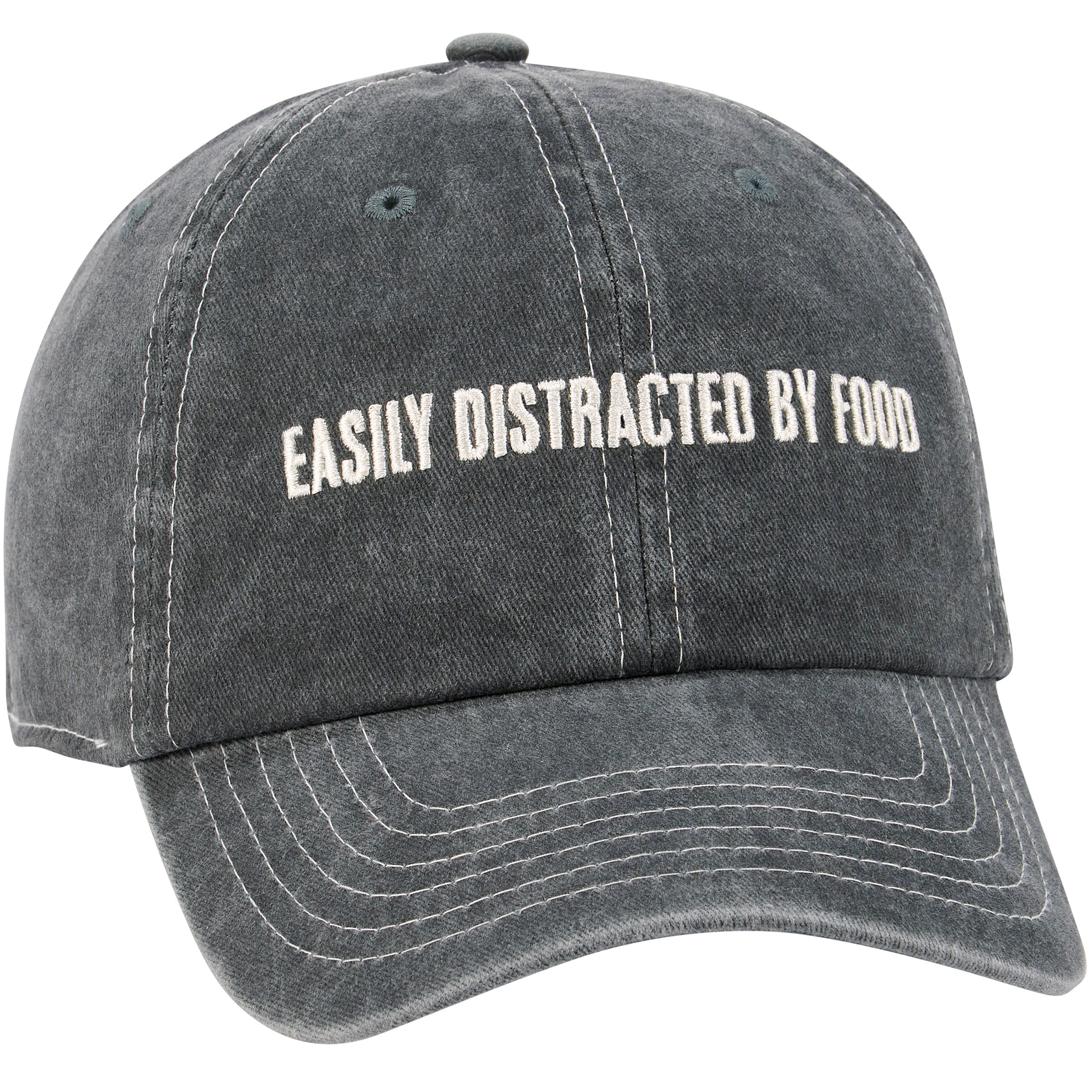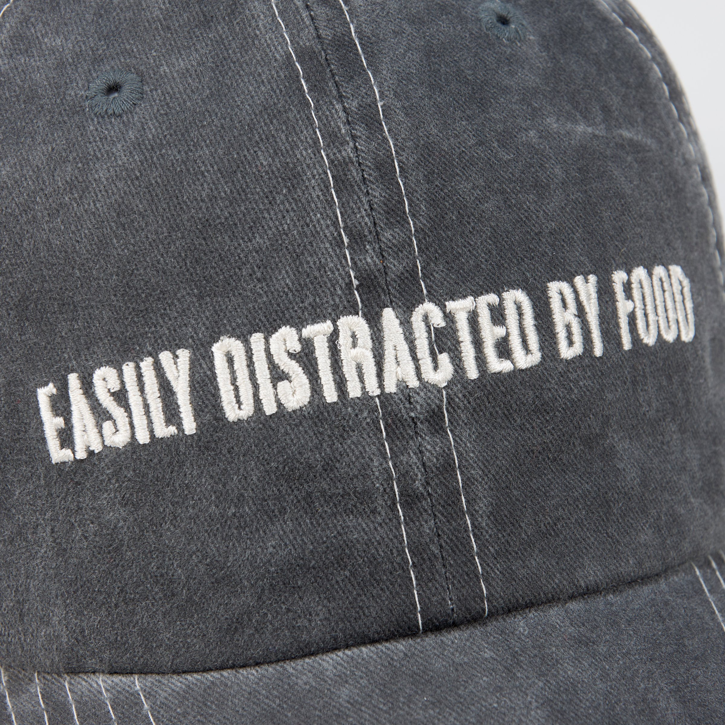 A stonewashed black baseball cap from our Foodie Collection displaying a humorous "Easily Distracted By Food" sentiment in a box sign style. Cap features embroidered sentiment for added detail. Our Distracted By Food baseball cap is one size fits most with an adjustable buckle closure to create the perfect fit. A fun accessory to wear for everyday use. Hand wash only.