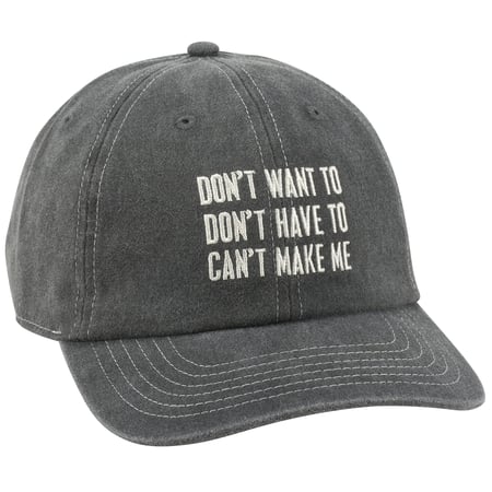 A stonewashed black baseball cap from our Box Sign Style Collection displaying a sassy sentiment in a classic box sign style that reads "Don't Want To - Don't Have To - Can't Make Me." This sassy hat features a fully embroidered design for added detail. Our Don't Want To Can't Make Me baseball cap is one size fits most with an adjustable metal buckle to create the perfect fit. Hand wash only. A fun gift perfect for an everyday accessory.