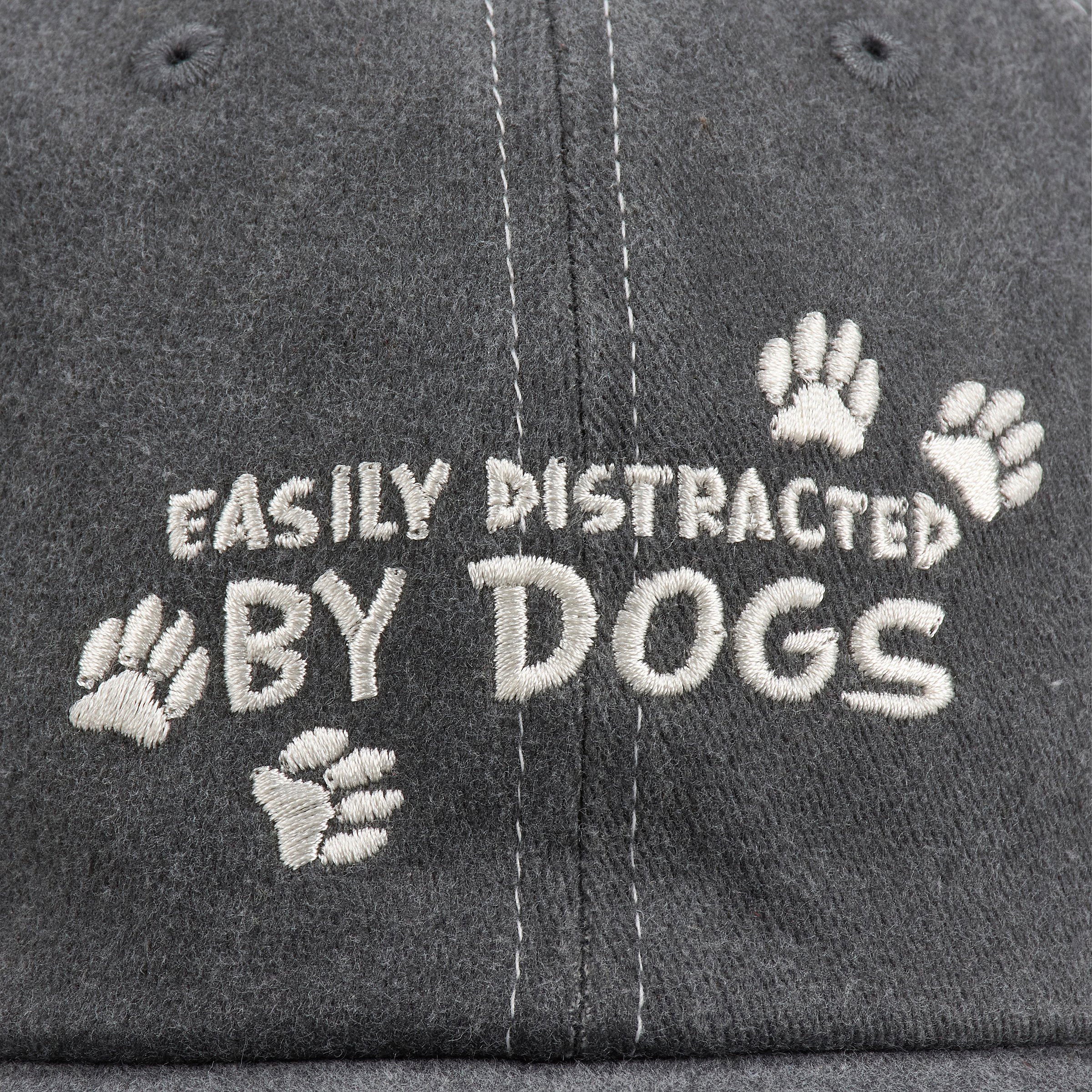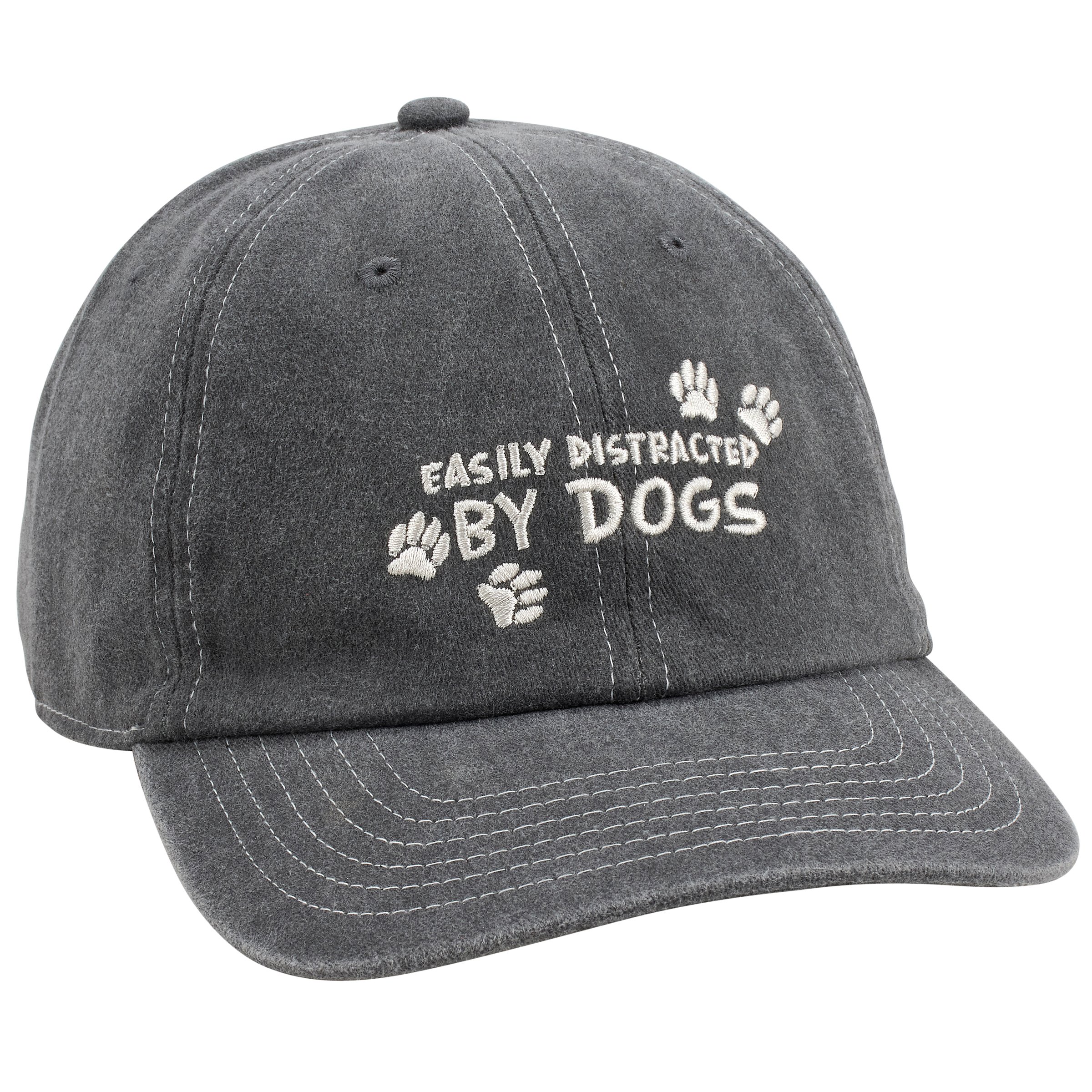 A stonewashed cotton baseball cap from our Pet Collection displaying paw prints around a fun dog inspired sentiment that reads "Easily Distracted By Dogs." Dog lover hat features a fully embroidered design that replicates all of the details of the original hand illustrated art as well as cream thread accents. Our Easily Distracted By Dogs baseball cap is one size fits most with an adjustable metal buckle to create the perfect fit. Hand wash only. A fun dog-themed gift perfect for showing off a love for pets every day.