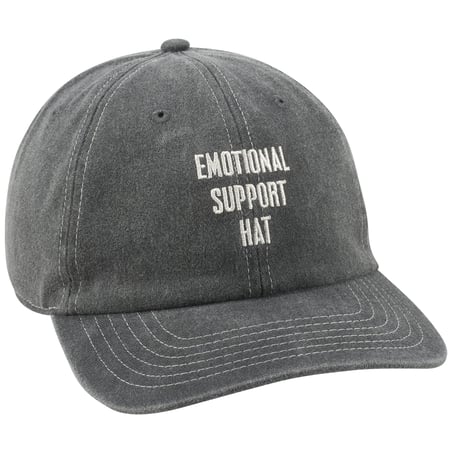 A stonewashed black baseball cap from our Box Sign Style Collection displaying a funny sentiment in a classic box sign style that reads "Emotional Support Hat." This funny hat features a fully embroidered design for added detail. Our Emotional Support Hat baseball cap is one size fits most with an adjustable metal buckle to create the perfect fit. Hand wash only. A fun gift perfect for an everyday accessory.