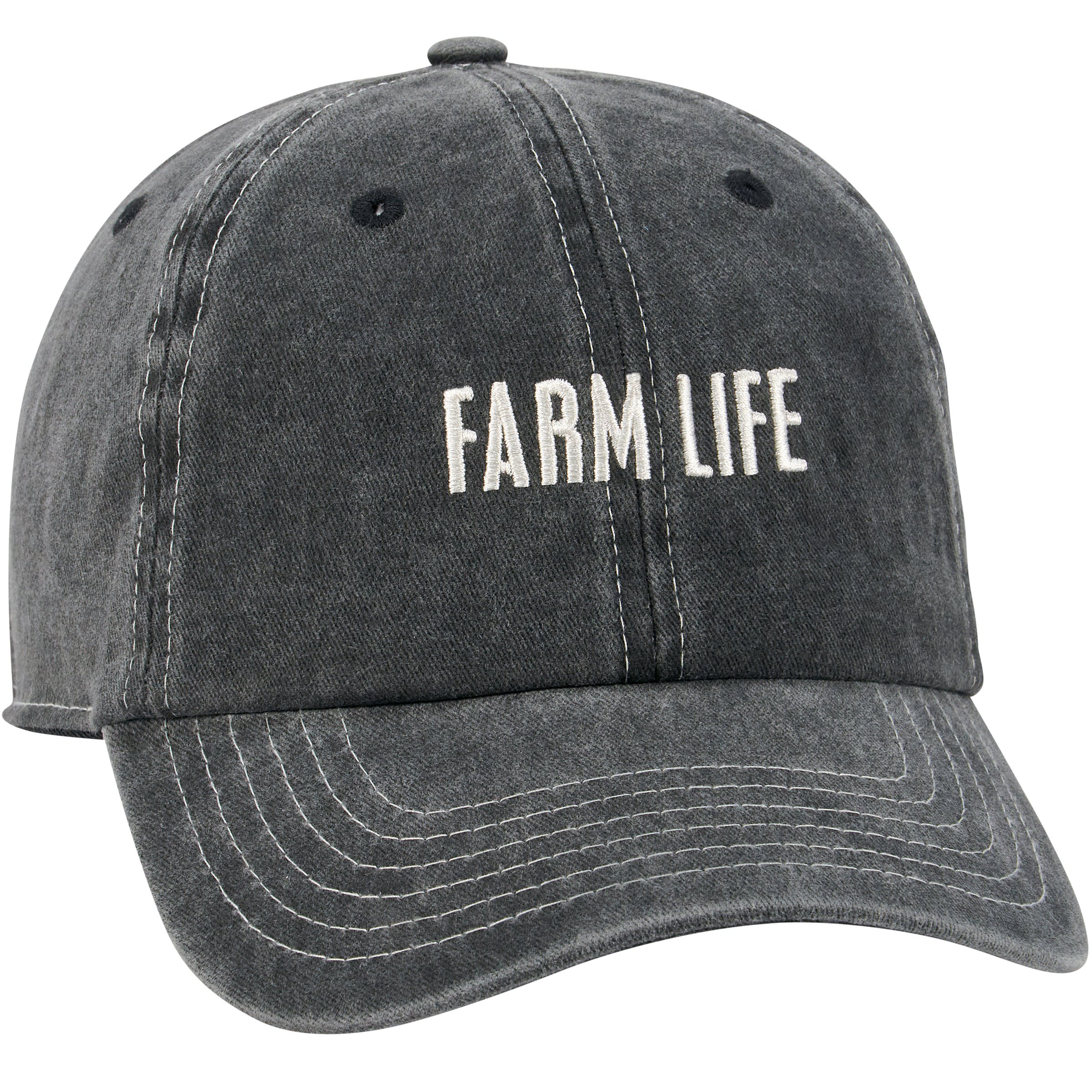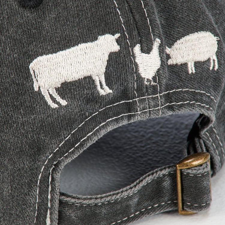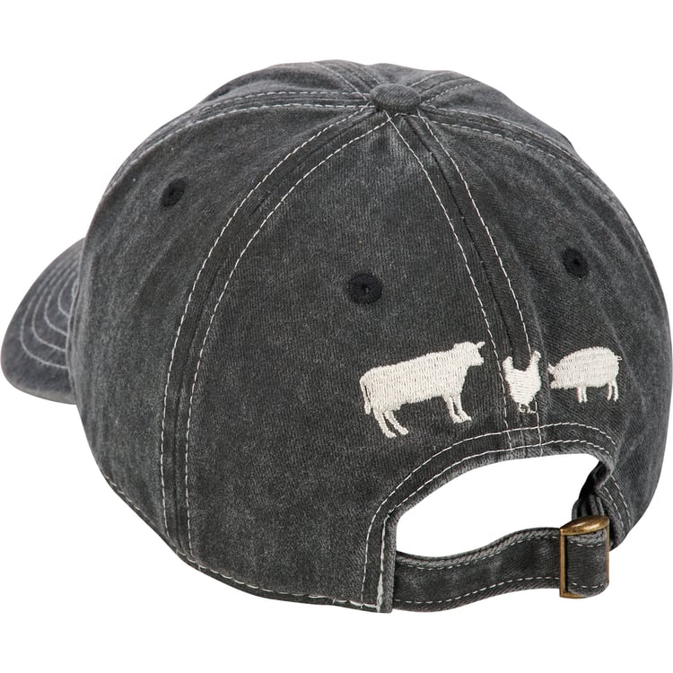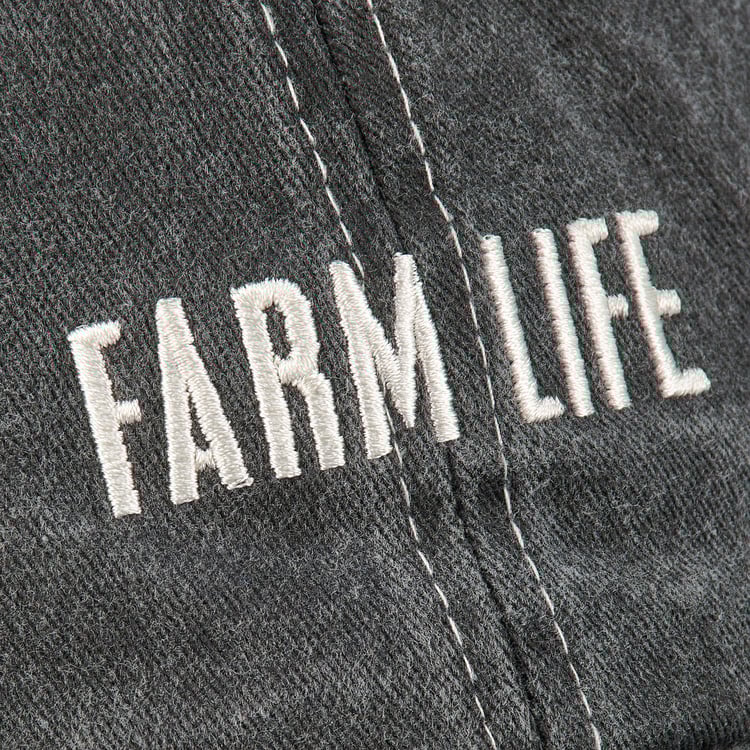 A stonewashed black baseball cap from our Farmhouse Collection displaying a fun "Farm Life" sentiment with cream thread accents and farm animal designs on the back. Cap features embroidered sentiment and designs for added detail. Our Farm Life hat is one size fits most with an adjustable buckle closure to create the perfect fit. A stylish accessory option for daily activities. Hand wash only.