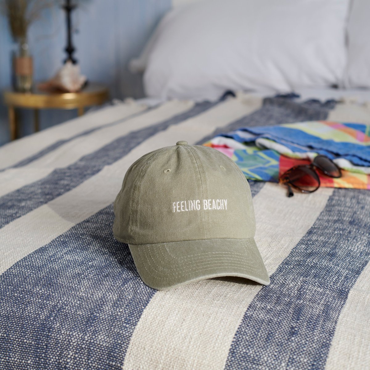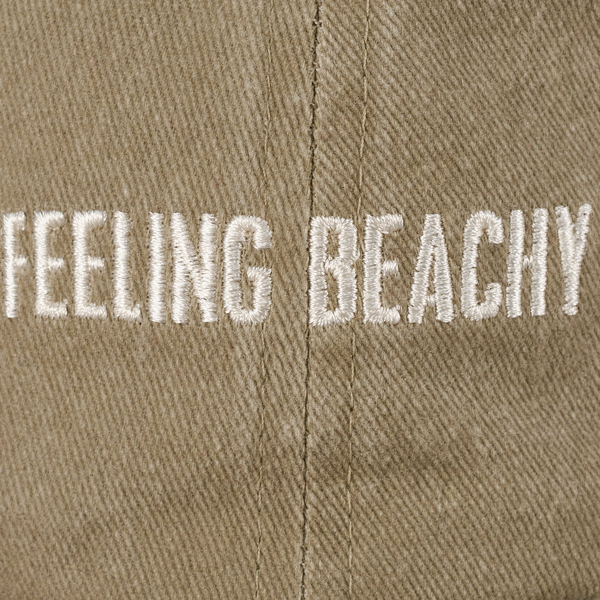 A tan baseball cap from our Beach Collection displaying a fun beach inspired sentiment in a box sign style that reads "Feeling Beachy." Beach hat features fully embroidered sentiment for added detail. Our Feeling Beachy baseball cap is one size fits most with an adjustable metal buckle to create the perfect fit. Hand wash only. A fun beach accessory perfect for a day in the sun.