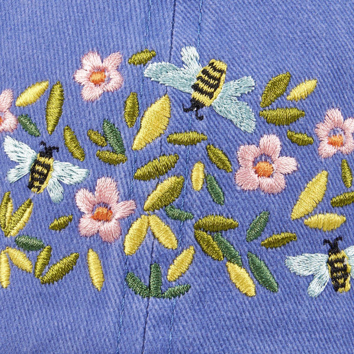 A periwinkle baseball cap from our Inspiration & Blooms Collection displaying a vibrant design of flowers and bees on the front with matching bee and flowers on the back. Baseball cap features fully embroidered designs for added detail. Our Choose Joy hat is one size fits most with an adjustable buckle closure to create the perfect fit. An inspirational accessory perfect for everyday wear. Hand wash only.