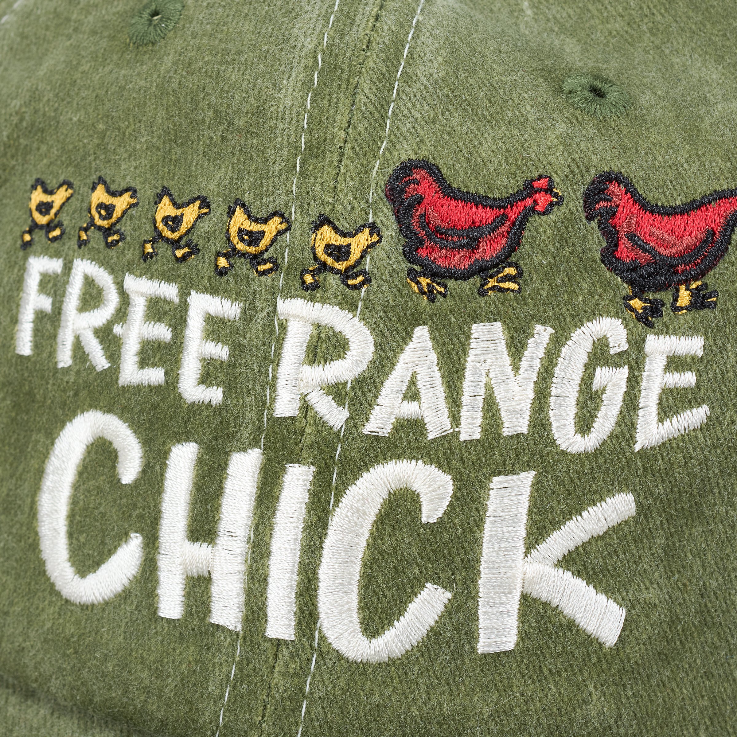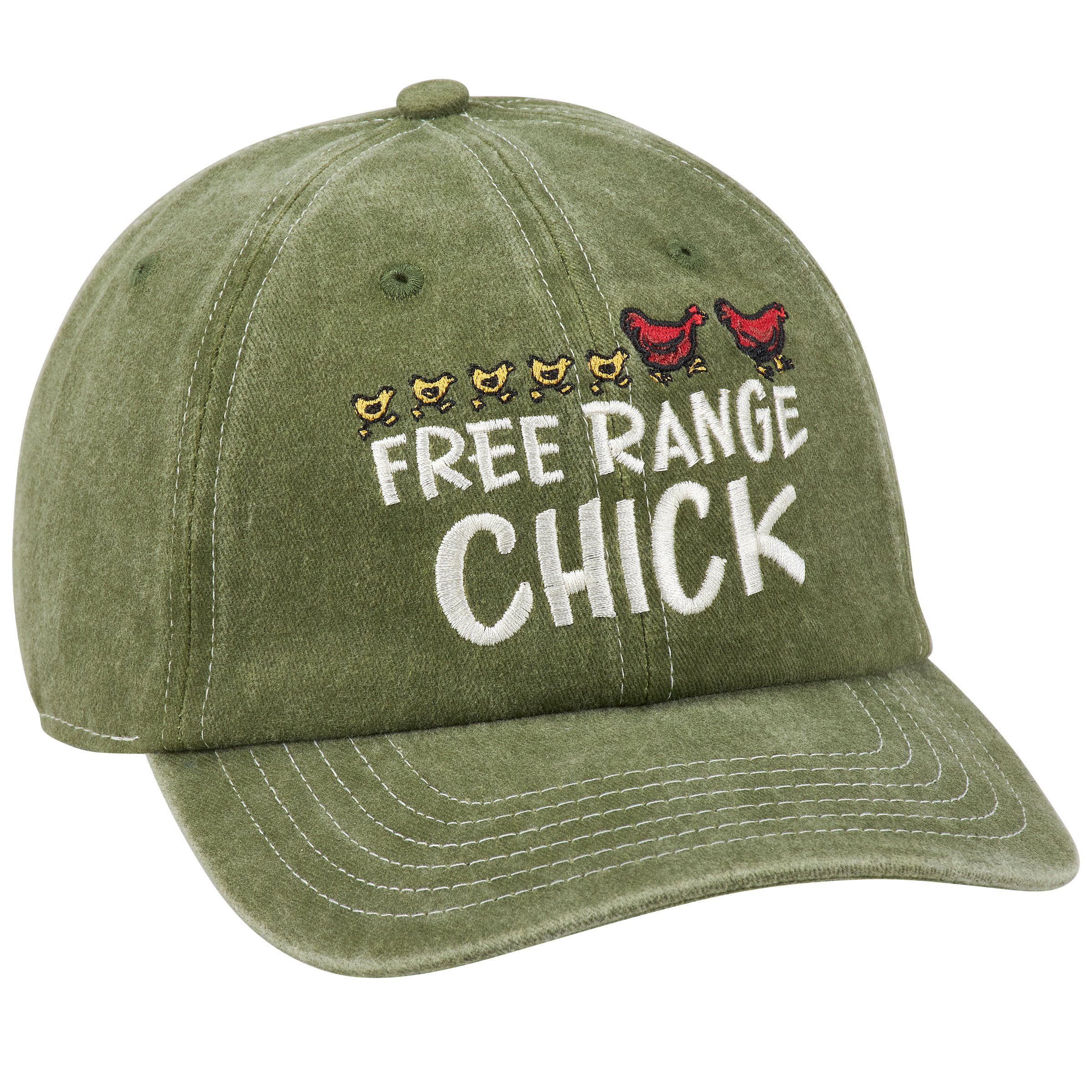 A stonewashed cotton baseball cap from our Homestead Collection displaying a line of farm chickens and chicks above a fun farm inspired sentiment that reads "Free Range Chick." Homestead hat features a fully embroidered design that replicates all of the details of the original hand illustrated art. Our Free Range Chick baseball cap is one size fits most with an adjustable metal buckle to create the perfect fit. Hand wash only. A fun farm-themed gift perfect for an everyday accessory that shows off their DIY lifestyle.