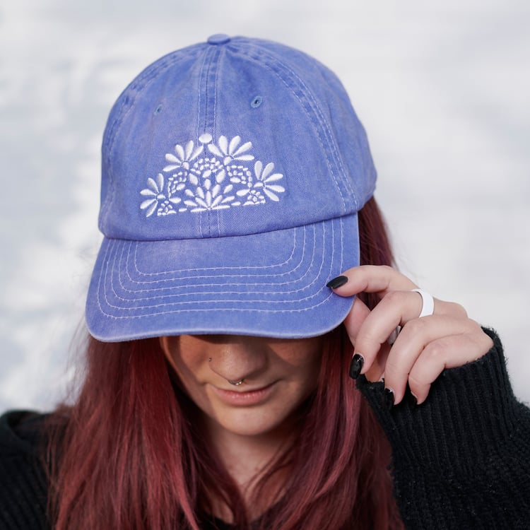 Inspiring calmness, this stonewashed cotton baseball cap in periwinkle from our Bohemian Collection features hand illustrated design on front and hand lettered "Free Spirit" sentiment on back. One size fits most and adjustable with metal buckle. The Free Spirit hat is hand-wash only.
