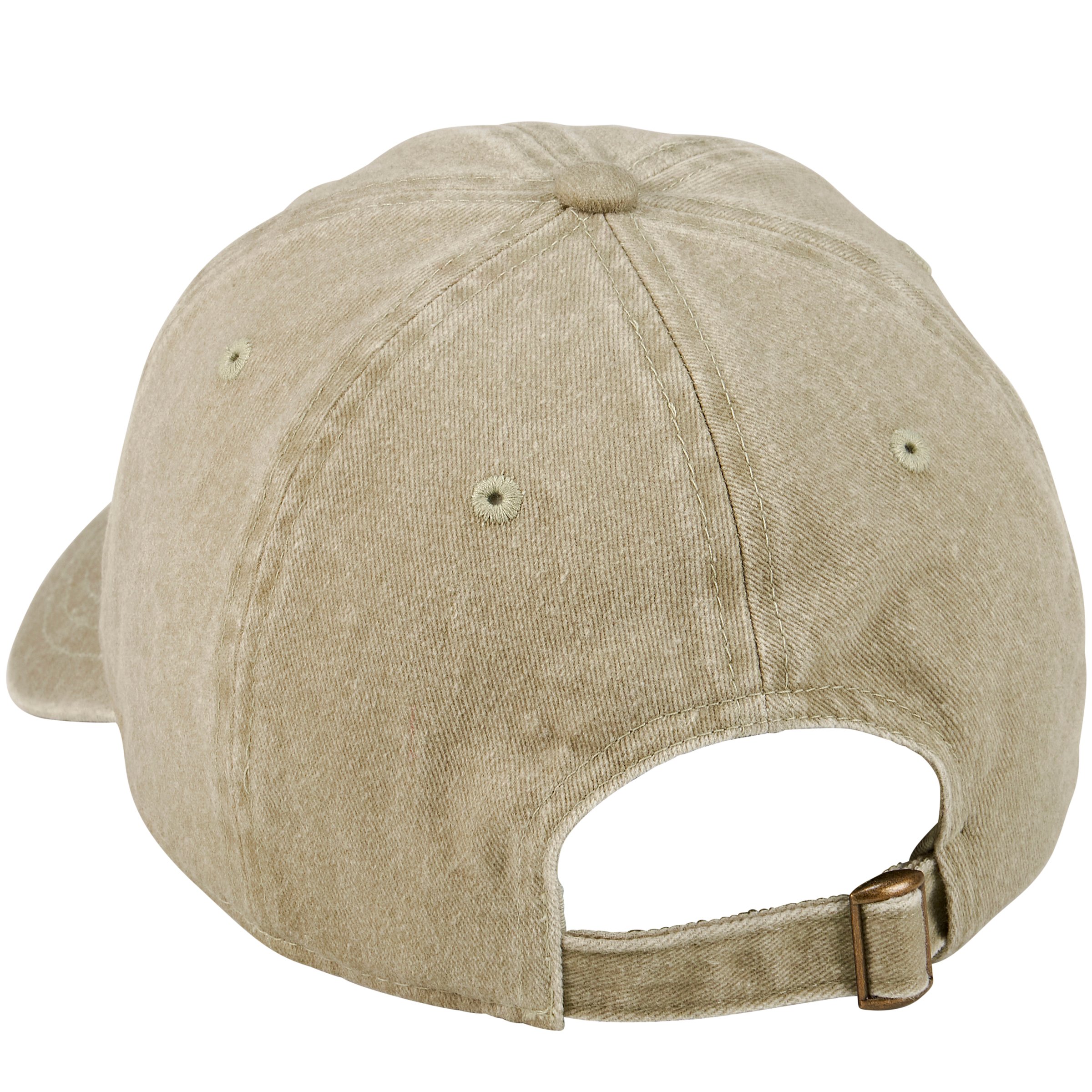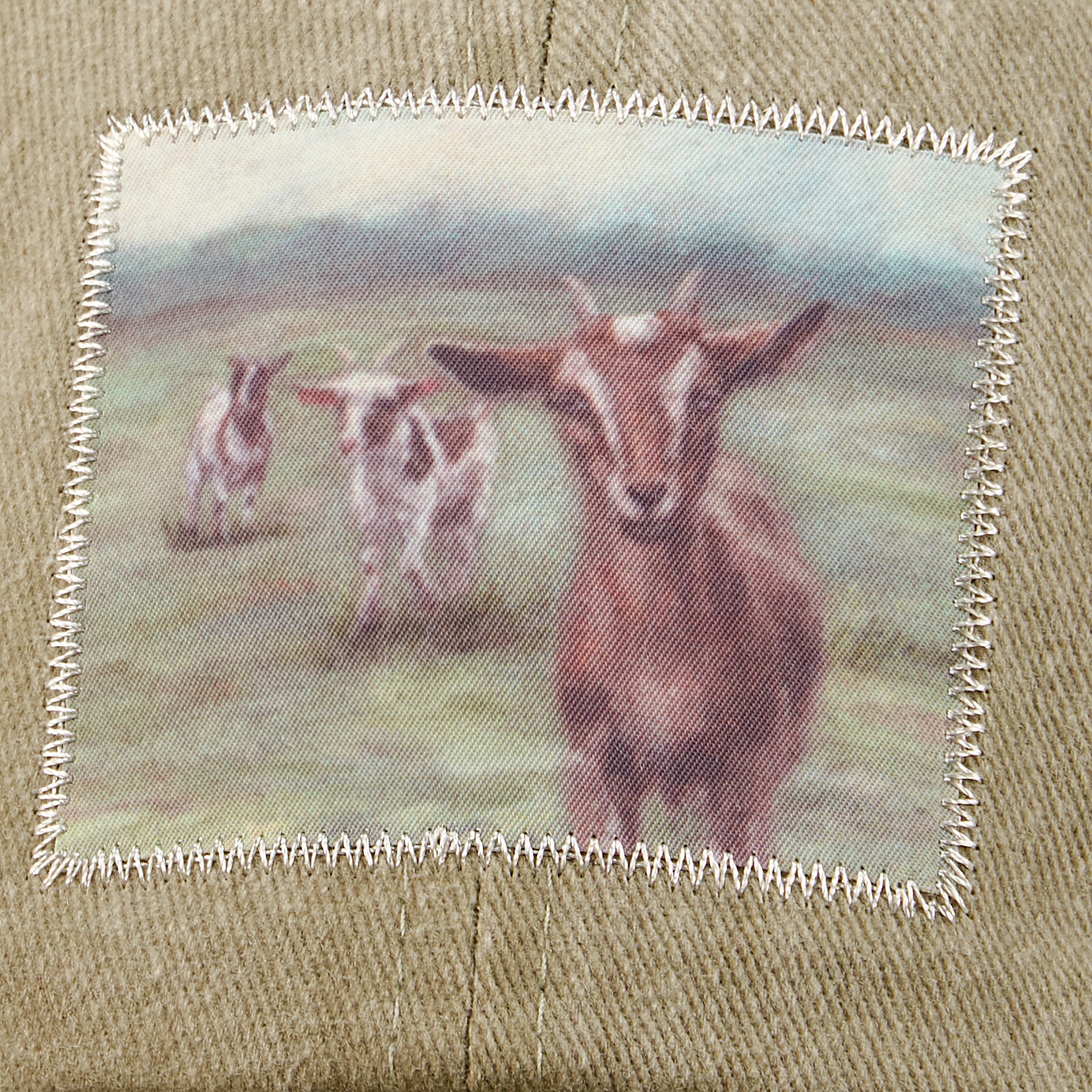 A stonewashed tan baseball cap from ourĀ Farmhouse Collection featuring a stitched art panel on the front displaying a farm inspired design of goats in a field. Design is replicated from original artwork painted onto burlap canvas, giving the art a unique depth and texture. Art panel features embroidered border for added detail. Our Goats hat is one size fits most with an adjustable buckle closure to create the perfect fit. A farm-themed baseball cap perfect for an everyday accessory. Hand wash only.