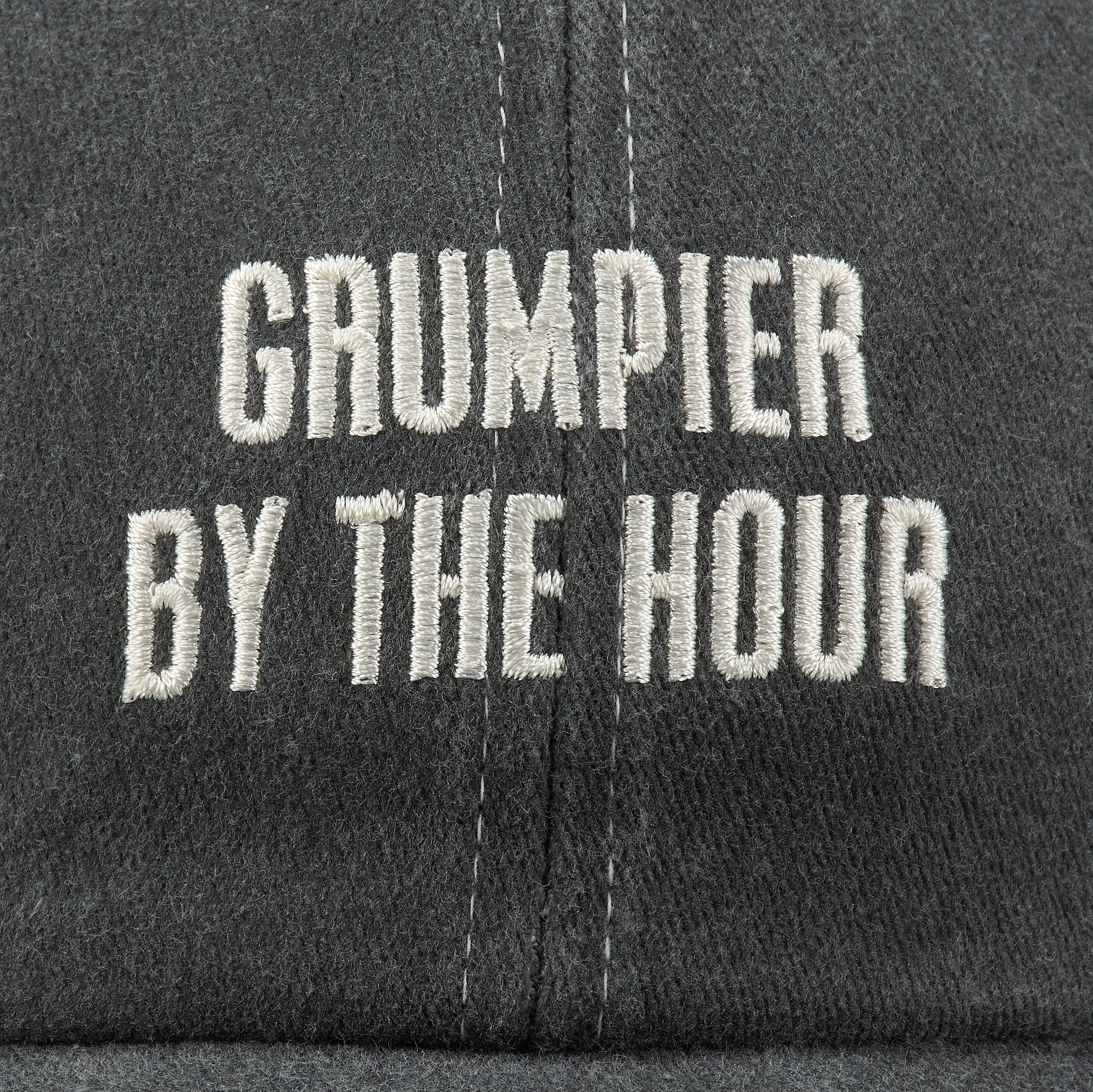 A stonewashed black baseball cap from our Box Sign Style Collection displaying a sassy sentiment in a classic box sign style that reads "Grumpier By The Hour." This sassy hat features a fully embroidered design for added detail. Our Grumpier By The Hour baseball cap is one size fits most with an adjustable metal buckle to create the perfect fit. Hand wash only. A fun gift perfect for an everyday accessory.