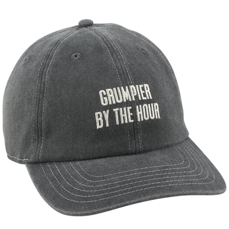 A stonewashed black baseball cap from our Box Sign Style Collection displaying a sassy sentiment in a classic box sign style that reads "Grumpier By The Hour." This sassy hat features a fully embroidered design for added detail. Our Grumpier By The Hour baseball cap is one size fits most with an adjustable metal buckle to create the perfect fit. Hand wash only. A fun gift perfect for an everyday accessory.
