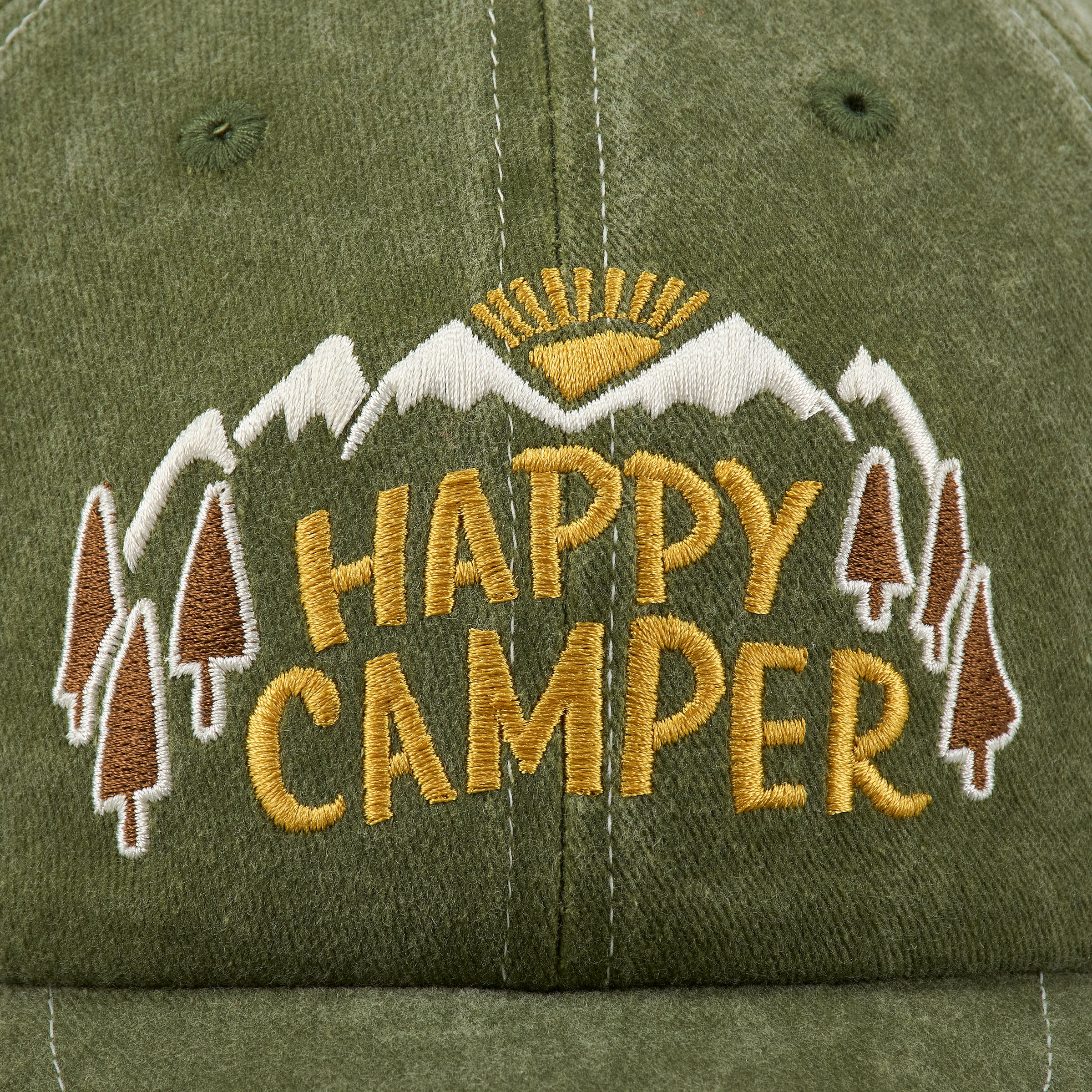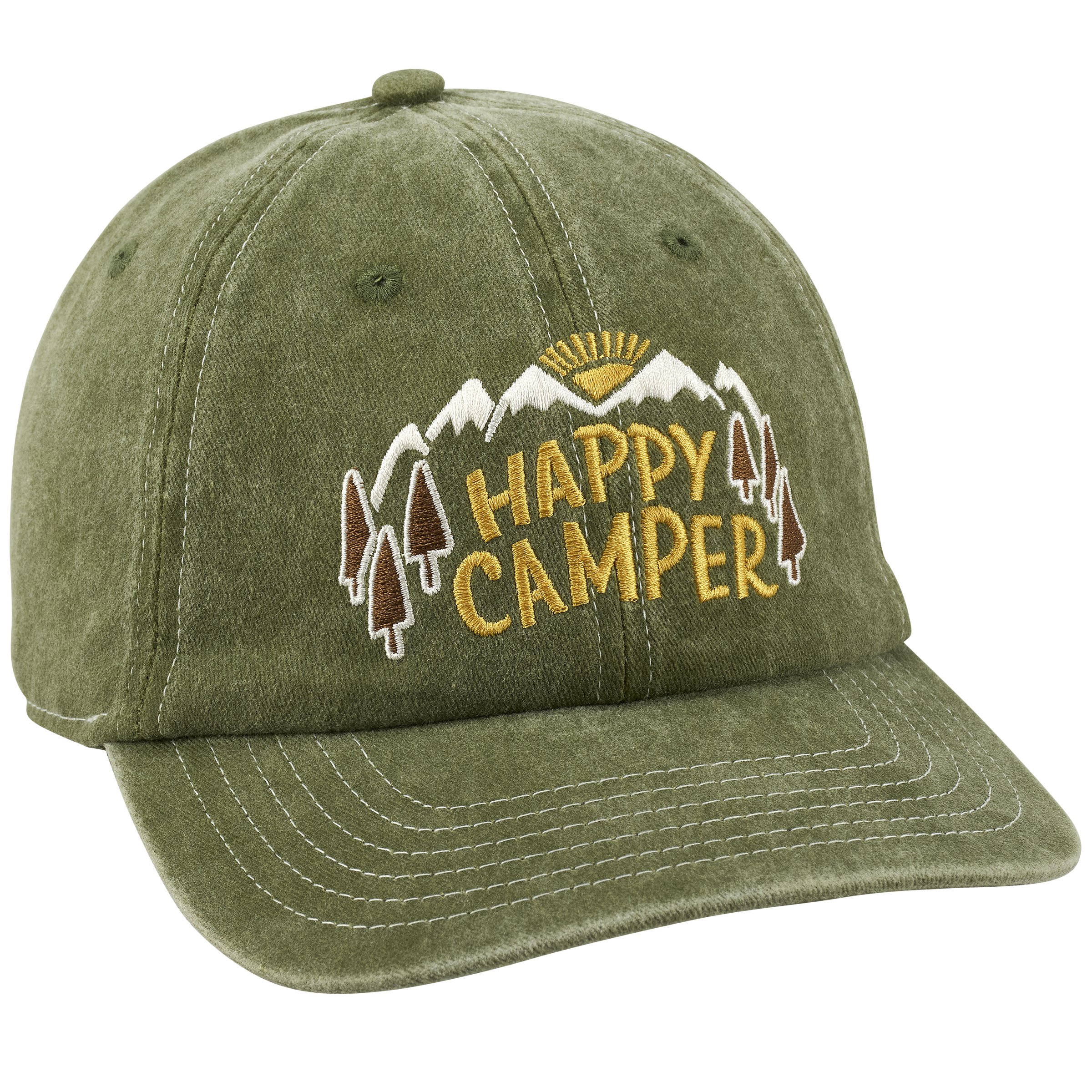 A stonewashed cotton baseball cap from our Lake & Cabin Collection displaying trees and mountain peaks above a fun camping inspired sentiment that reads "Happy Camper." Camping hat features a fully embroidered design that replicates all of the details of the original hand illustrated art. Our Happy Camper baseball cap is one size fits most with an adjustable metal buckle to create the perfect fit. Hand wash only. A fun camping-themed gift perfect for an outdoor accessory.