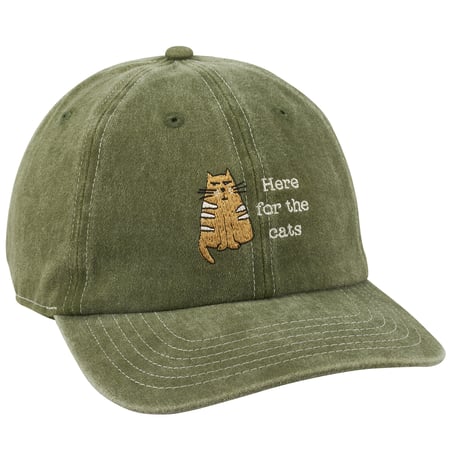 A stonewashed green baseball cap from our Pet Collection displaying a sassy cat with a fun cat themed sentiment that reads "Here For The Cats" on the front as well as paw prints on the back. This cat lover hat features fully embroidered designs that replicate all of the details of the original hand illustrated art. Our Here For The Cats baseball cap is one size fits most with an adjustable metal buckle to create the perfect fit. Hand wash only. A fun cat-themed gift perfect for showing off a love for pets every day.