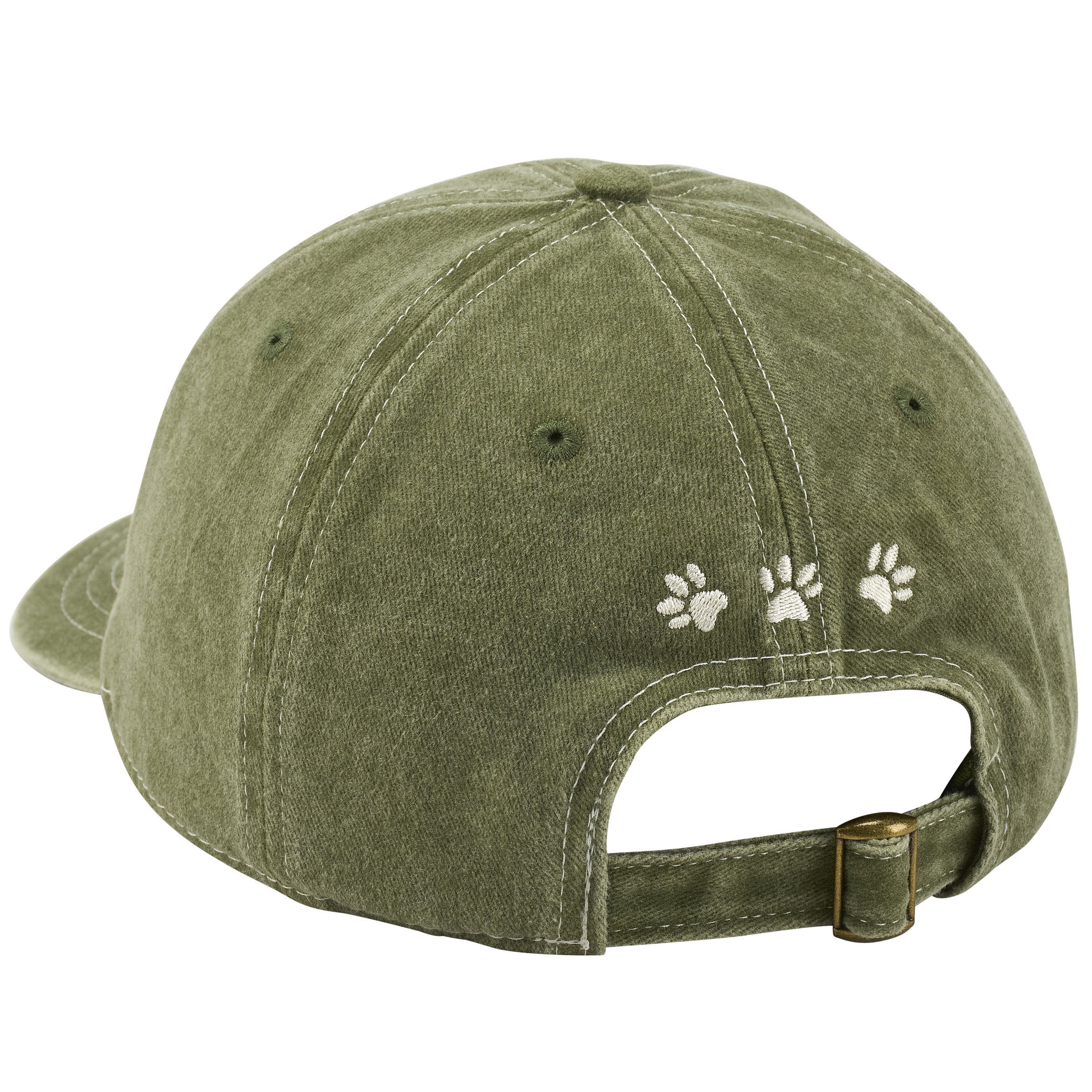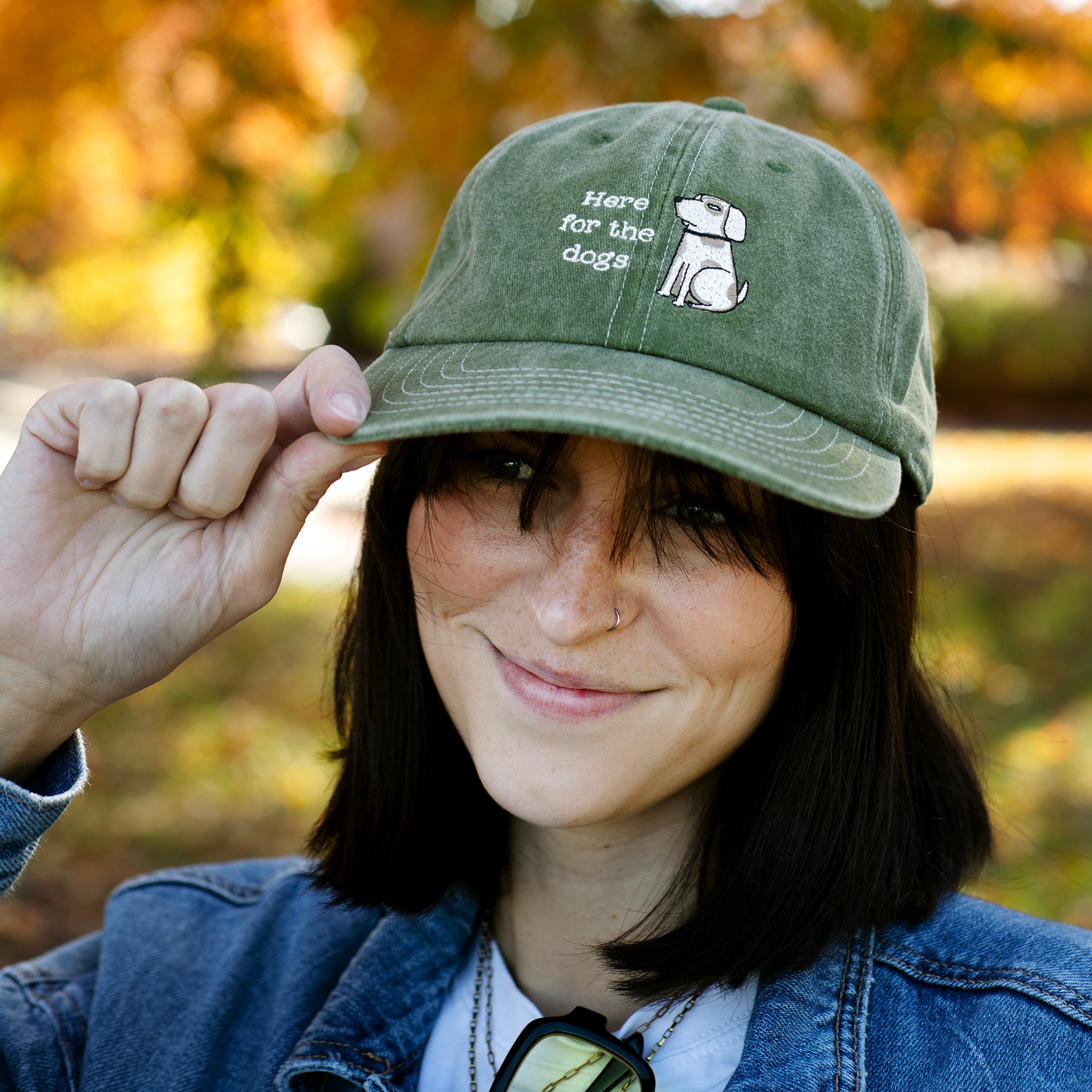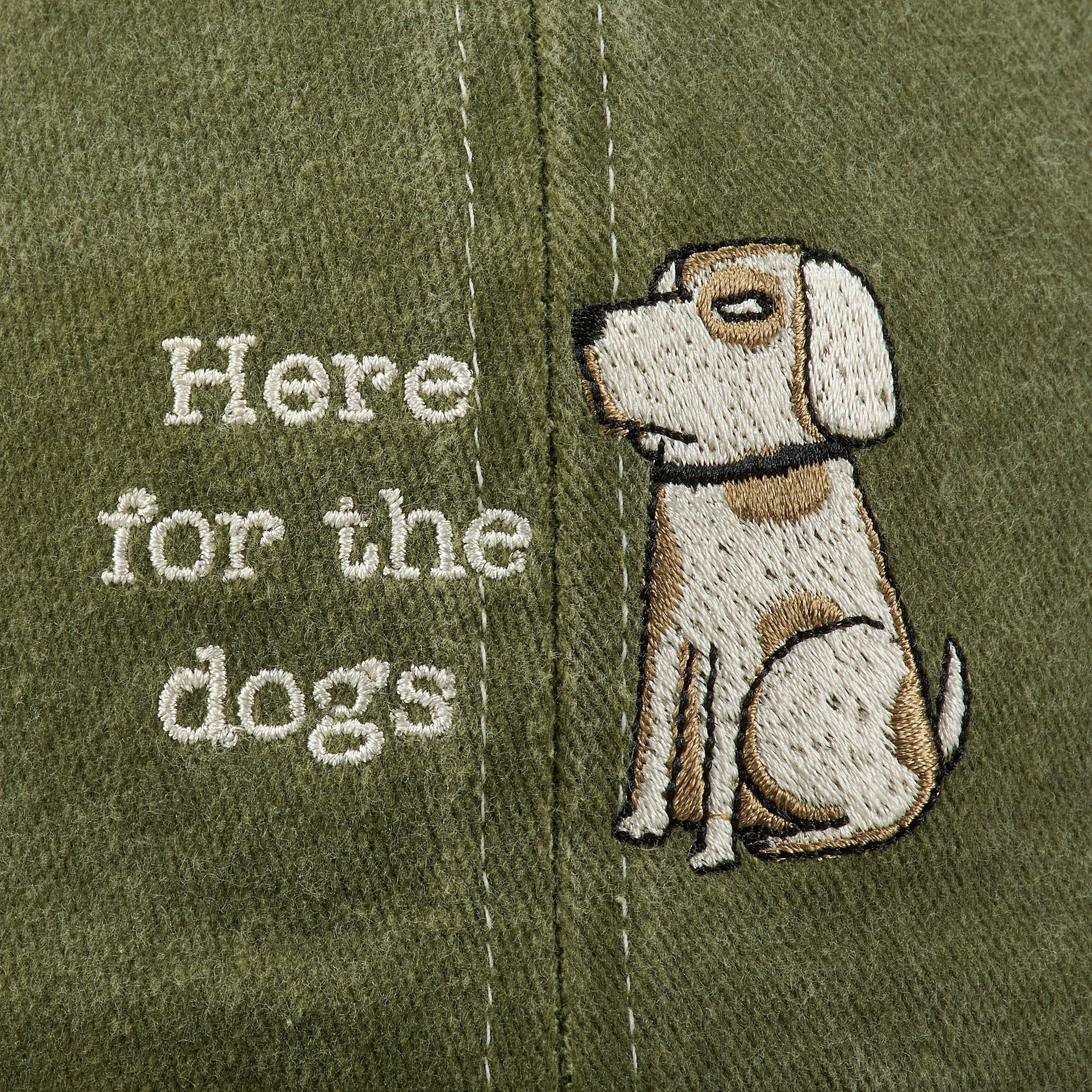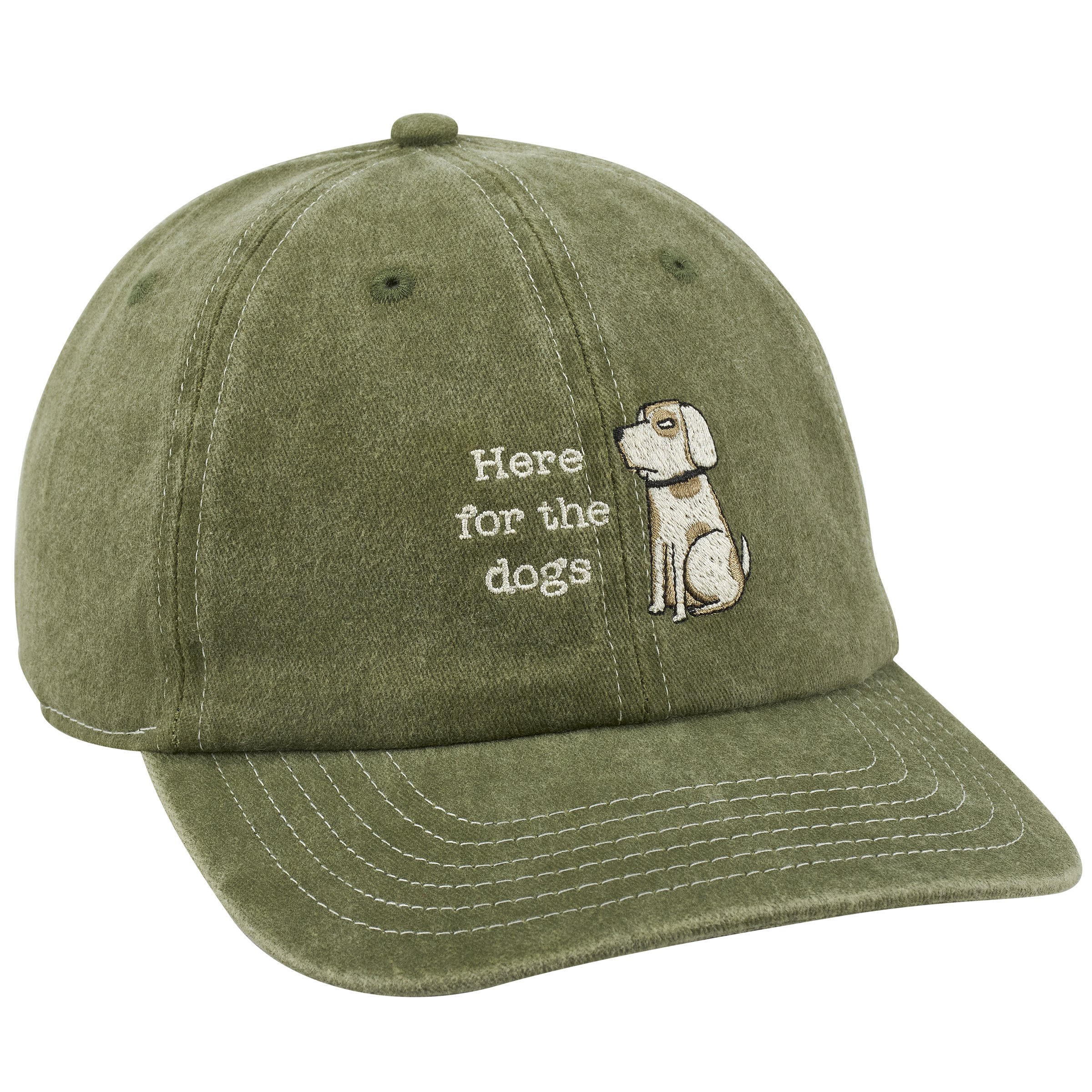 A stonewashed green baseball cap from our Pet Collection displaying a sassy dog with a fun dog themed sentiment that reads "Here For The Dogs" on the front as well as paw prints on the back. This dog lover hat features fully embroidered designs that replicate all of the details of the original hand illustrated art. Our Here For The Dogs baseball cap is one size fits most with an adjustable metal buckle to create the perfect fit. Hand wash only. A fun dog-themed gift perfect for showing off a love for pets every day.