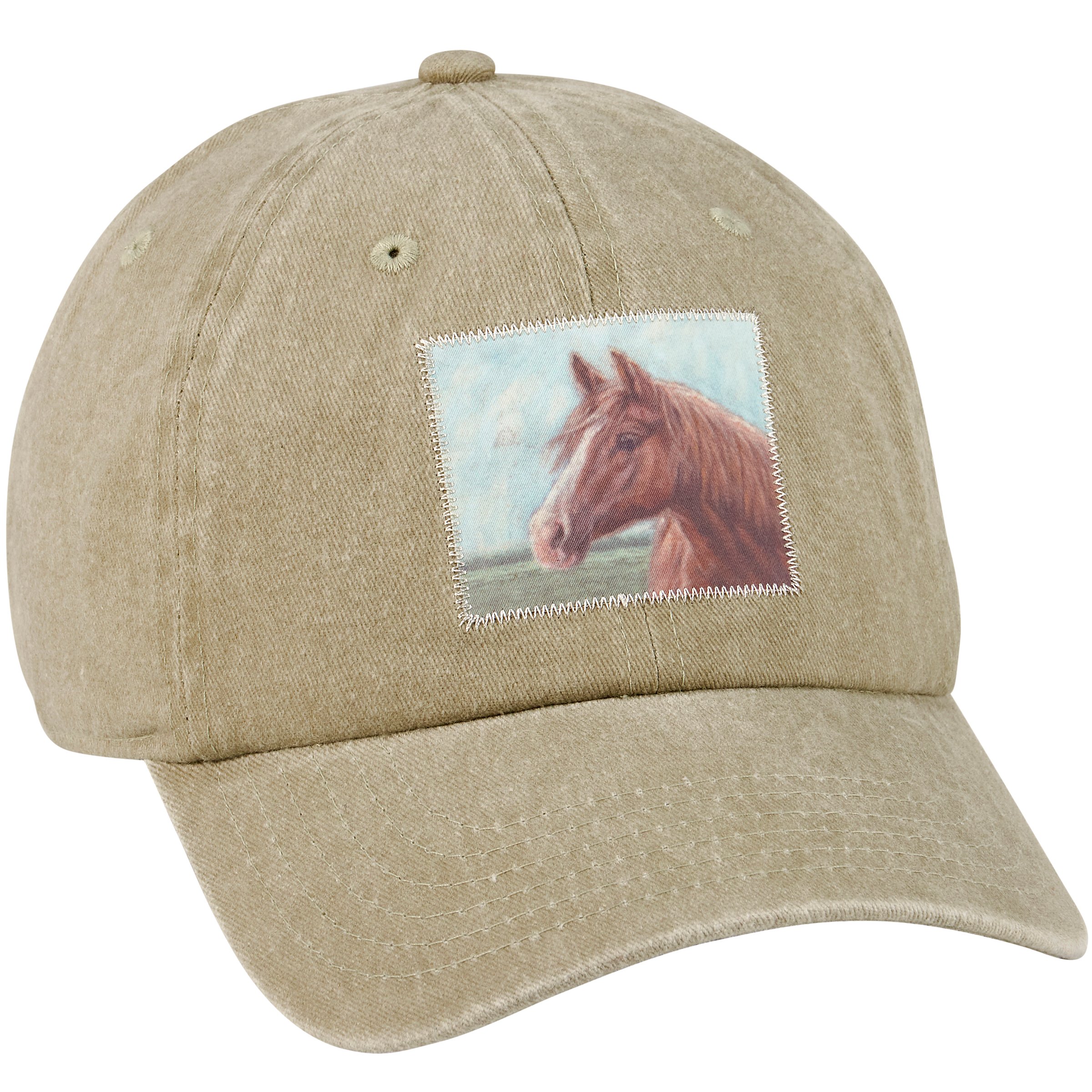 A stonewashed tan baseball cap from ourĀ Farmhouse Collection featuring a stitched art panel on the front displaying a farm inspired design of a horse in a field. Design is replicated from original artwork painted onto burlap canvas, giving the art a unique depth and texture. Art panel features embroidered border for added detail. Our Horse hat is one size fits most with an adjustable buckle closure to create the perfect fit. A farm-themed baseball cap perfect for an everyday accessory. Hand wash only.