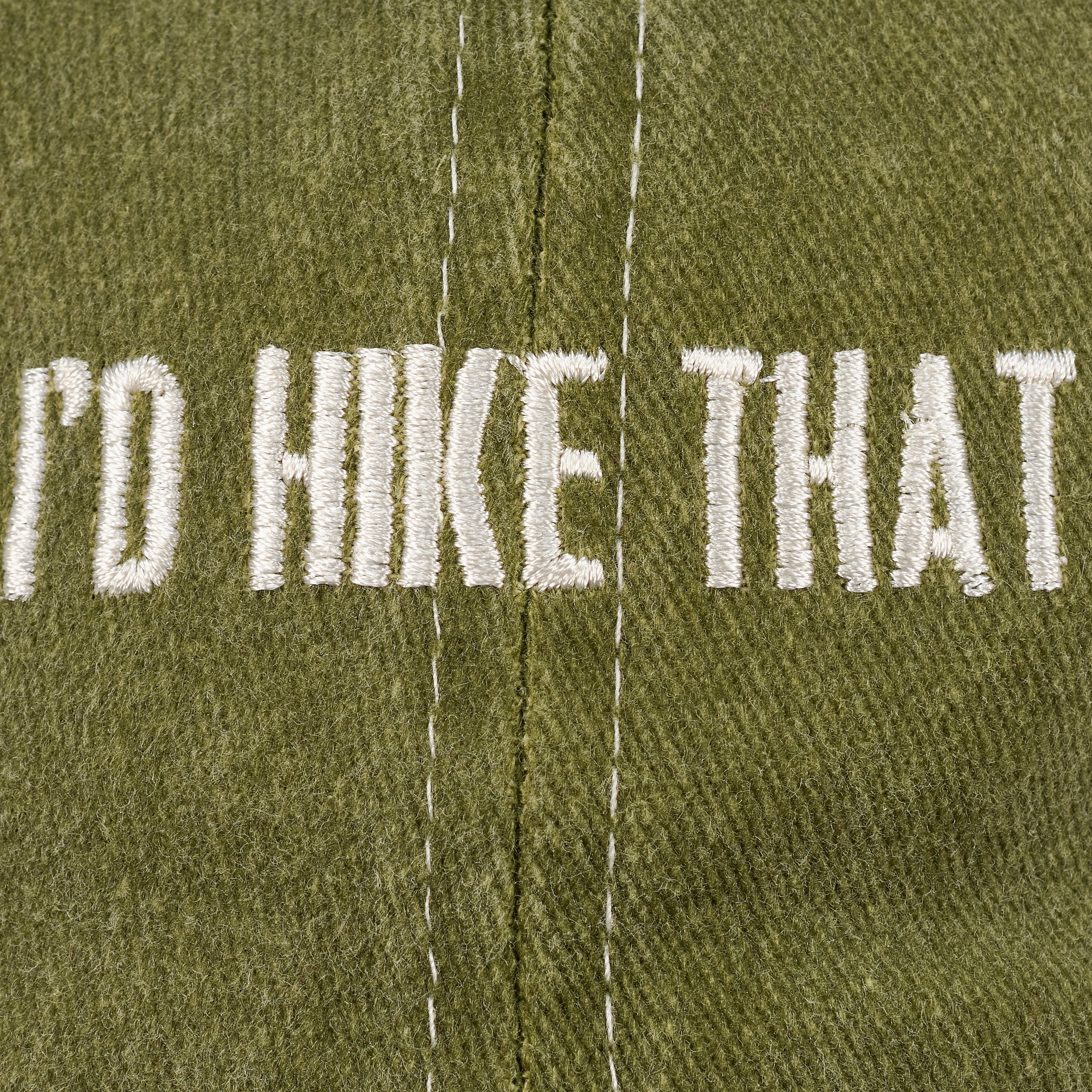 A stonewashed green baseball cap from our Lake & Cabin Collection displaying a fun hiking inspired sentiment in a box sign style that reads "I'd Hike That" with cream thread accents. Hiking hat features fully embroidered sentiment for added detail. Our I'd Hike That baseball cap is one size fits most with an adjustable metal buckle to create the perfect fit. Hand wash only. A fun hiking accessory great for gifting.