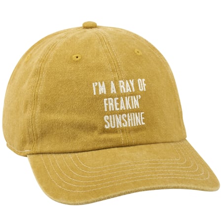 A stonewashed yellow baseball cap from our Box Sign Style Collection displaying a sassy sentiment in a classic box sign style that reads "I'm A Ray Of Freakin' Sunshine." This sassy hat features a fully embroidered design for added detail. Our I'm A Ray Of Freakin' Sunshine baseball cap is one size fits most with an adjustable metal buckle to create the perfect fit. Hand wash only. A fun gift perfect for an everyday accessory.
