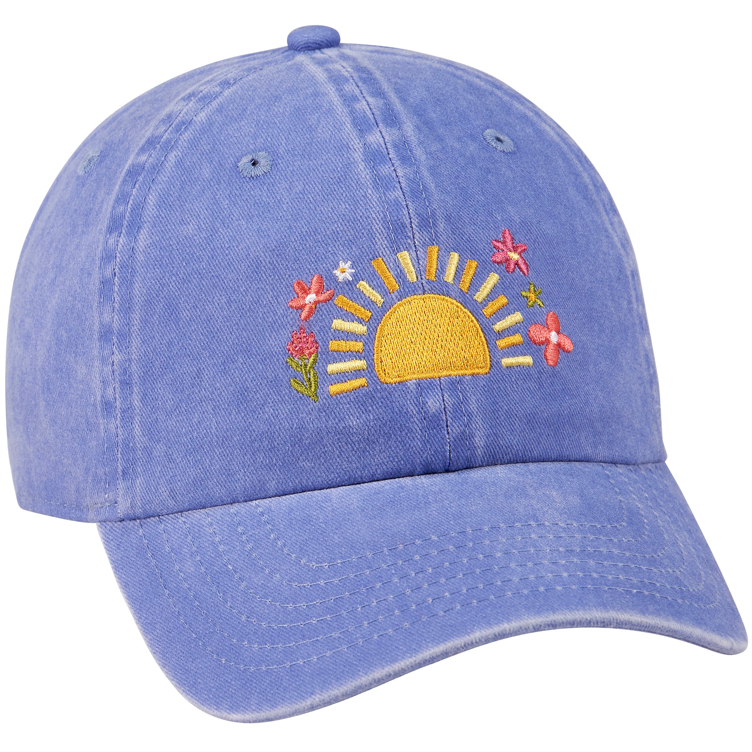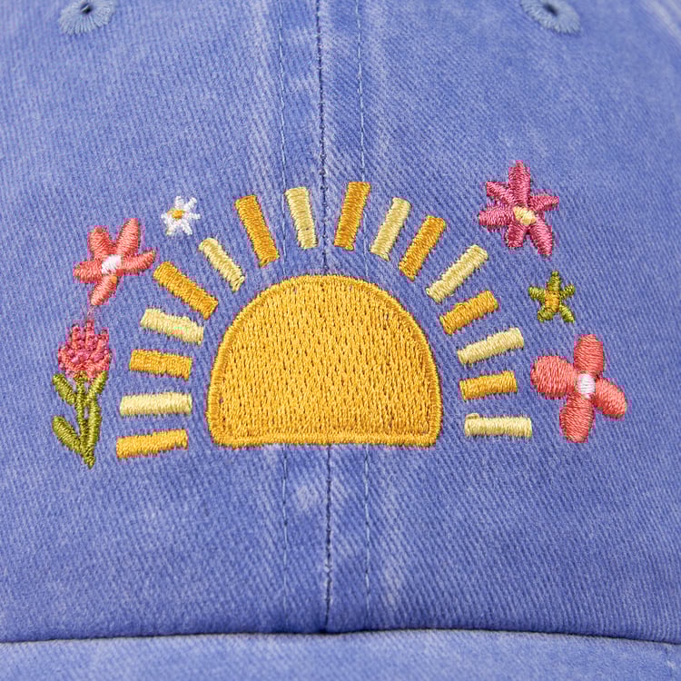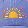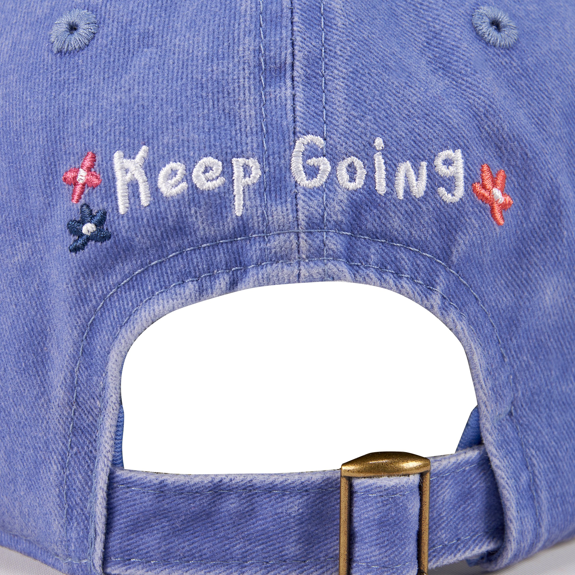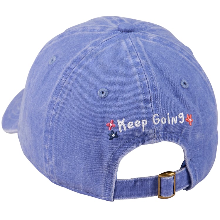 A stonewashed blue baseball cap from our Inspiration & Blooms Collection displaying a vibrant design of the sun with flowers on the front with matching flowers and inspirational sentiment on the back that reads "Keep Going." Inspirational hat features fully embroidered designs for added detail. Our Keep Going baseball cap is one size fits most with an adjustable metal buckle to create the perfect fit. Hand wash only. An inspirational gift perfect for an everyday accessory.