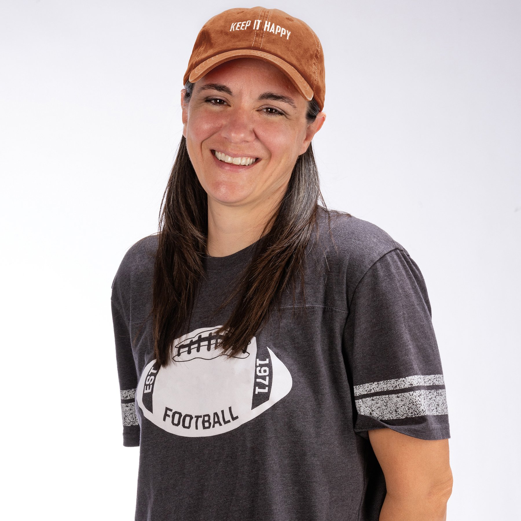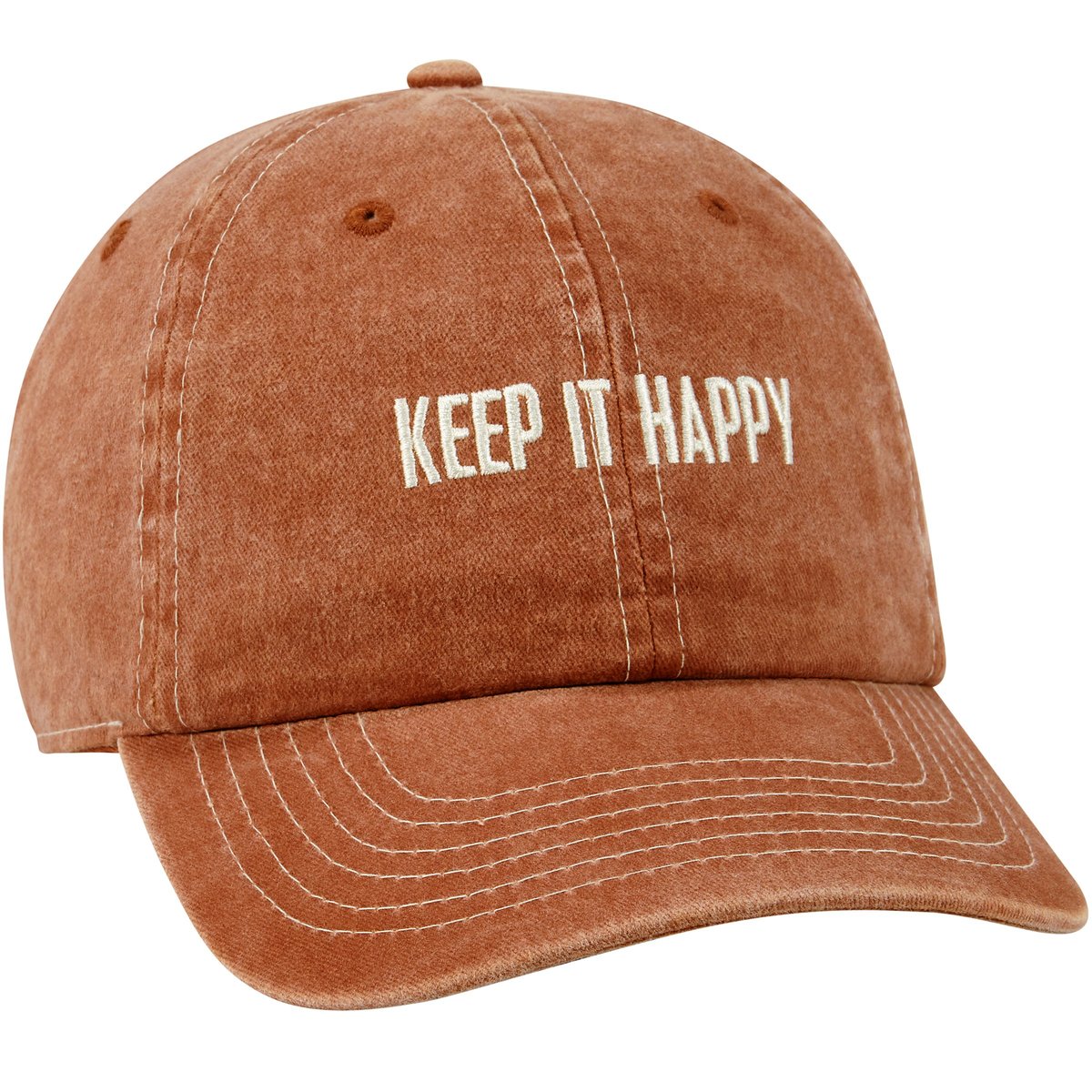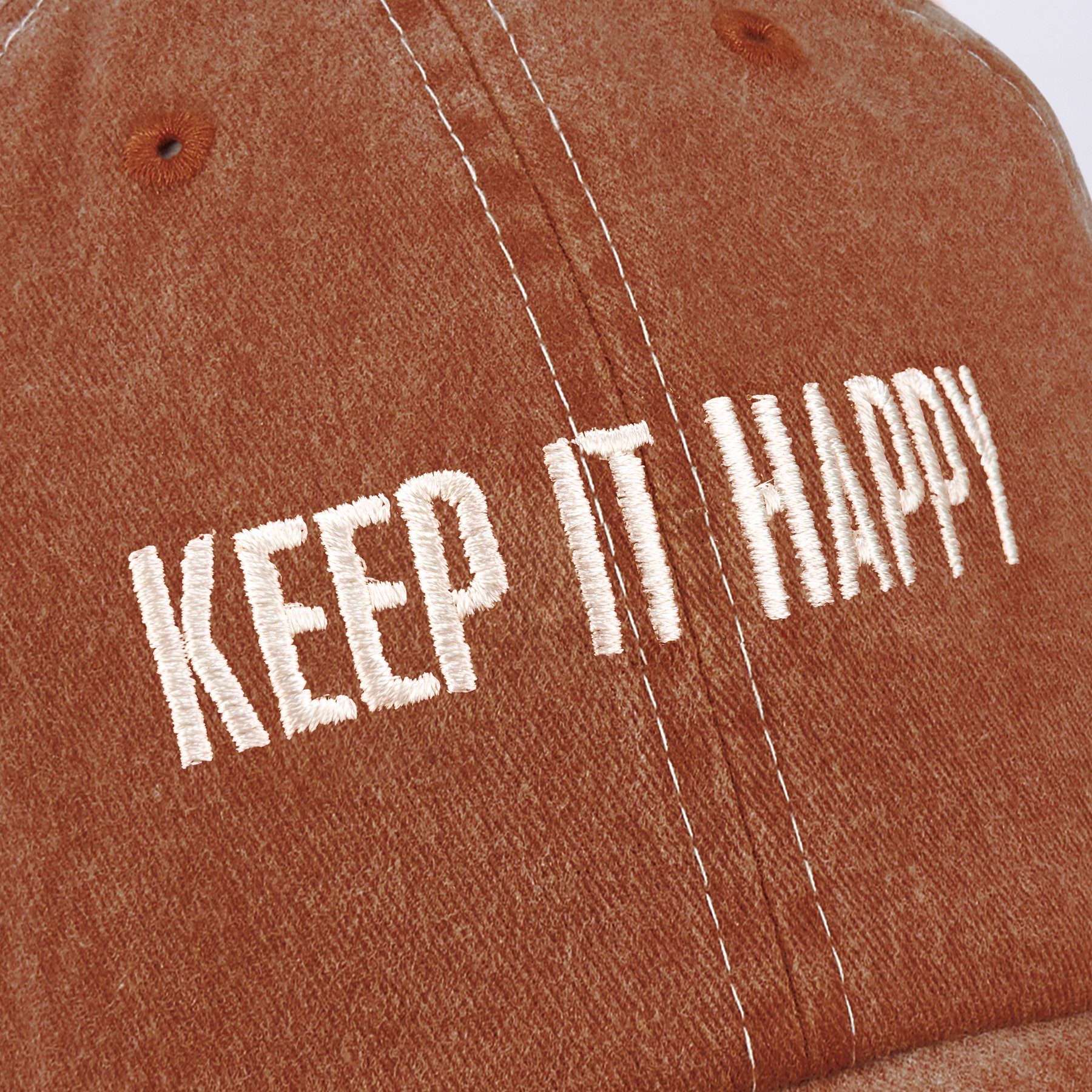 A cotton baseball cap featuring an embroidered "Keep It Happy" sentiment on an orange base. Features adjustable brass closure on the back. Our Keep It Happy hat is one size fits most. Hand-wash only.