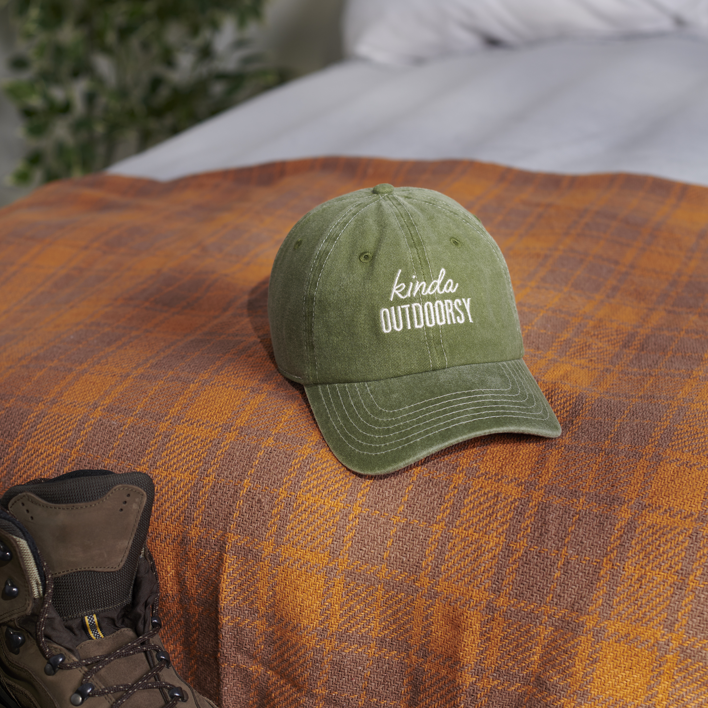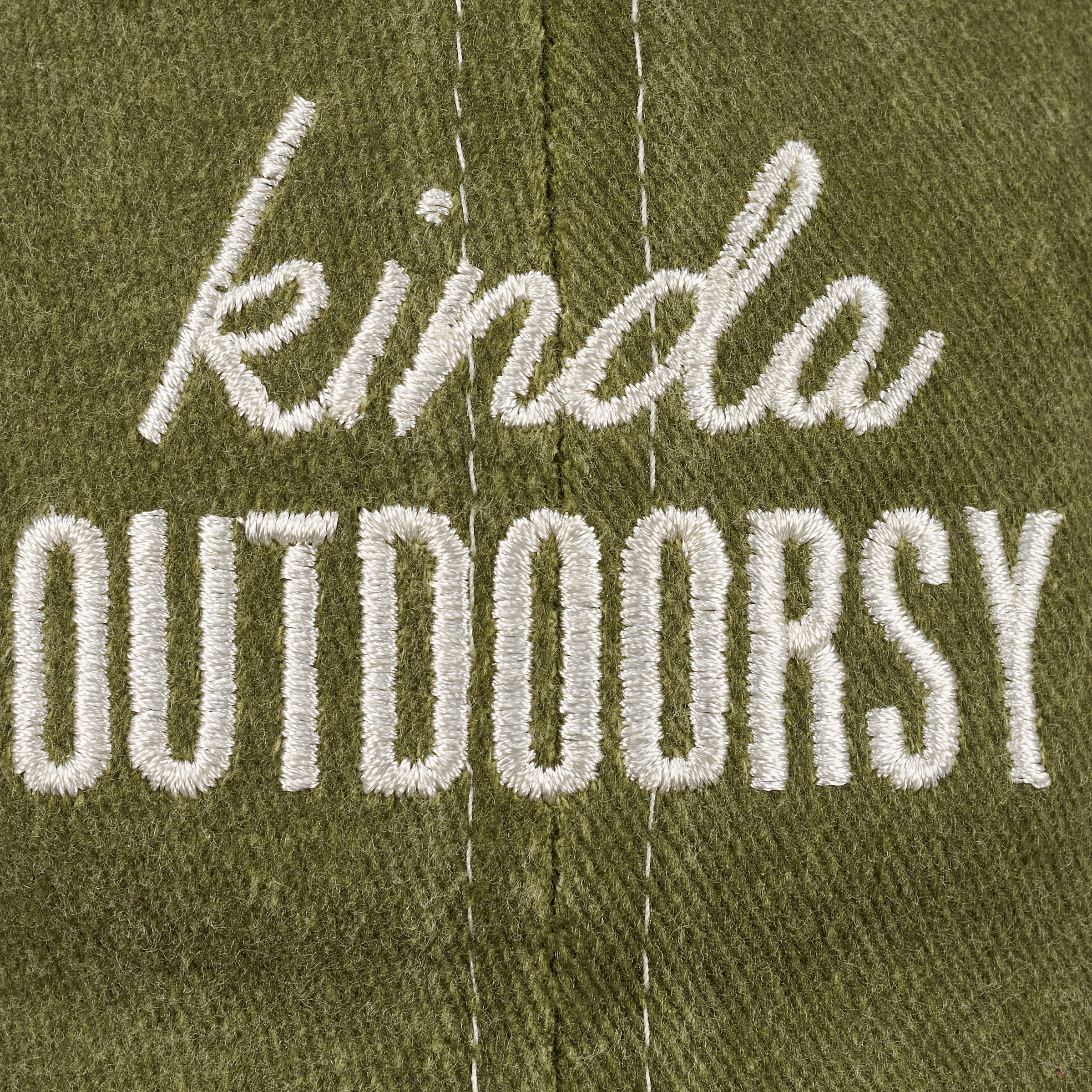 A stonewashed green baseball cap from our Lake & Cabin Collection displaying a fun outdoor inspired sentiment in a box sign style that reads "Kinda Outdoorsy" with cream thread accents. Outdoor hat features fully embroidered sentiment for added detail. Our Kinda Outdoorsy baseball cap is one size fits most with an adjustable metal buckle to create the perfect fit. Hand wash only. A fun outdoor accessory great for gifting.