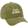 A stonewashed green baseball cap from our Lake & Cabin Collection displaying a fun outdoor inspired sentiment in a box sign style that reads "Kinda Outdoorsy" with cream thread accents. Outdoor hat features fully embroidered sentiment for added detail. Our Kinda Outdoorsy baseball cap is one size fits most with an adjustable metal buckle to create the perfect fit. Hand wash only. A fun outdoor accessory great for gifting.