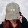 A stonewashed green baseball cap from our Lake & Cabin Collection displaying a fun "Lake Life" sentiment with cream thread accents. Cap features embroidered sentiment for added detail. Our Lake Life hat is one size fits most with an adjustable buckle closure to create the perfect fit. A stylish accessory option for an outdoor adventure. Hand wash only.