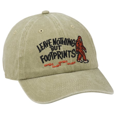 A stonewashed cotton baseball cap from our Lake & Cabin Collection displaying a bigfoot and footprints under a fun bigfoot inspired sentiment that reads "Leave Nothing But Footprints." Bigfoot hat features a fully embroidered design that replicates all of the details of the original hand illustrated art. Our Nothing But Footprints baseball cap is one size fits most with an adjustable metal buckle to create the perfect fit. Hand wash only. A fun bigfoot-themed gift perfect for an outdoor accessory.