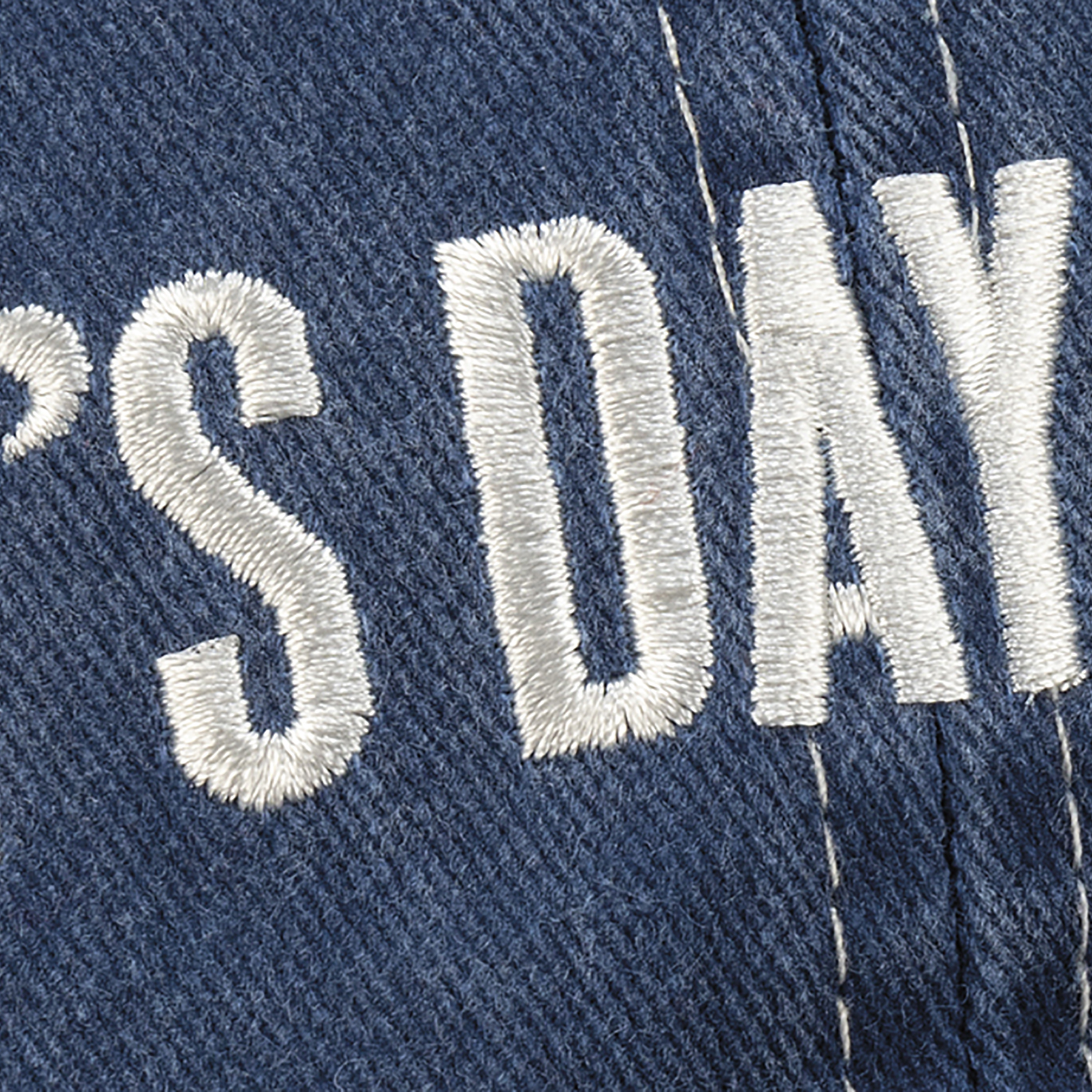 A cotton baseball cap with an adjustable brass closure on the back. Features box sign style "Let's Day Drink" sentiment embroidered in cream onto a weathered navy blue base. One size fits most. Hand-wash only.