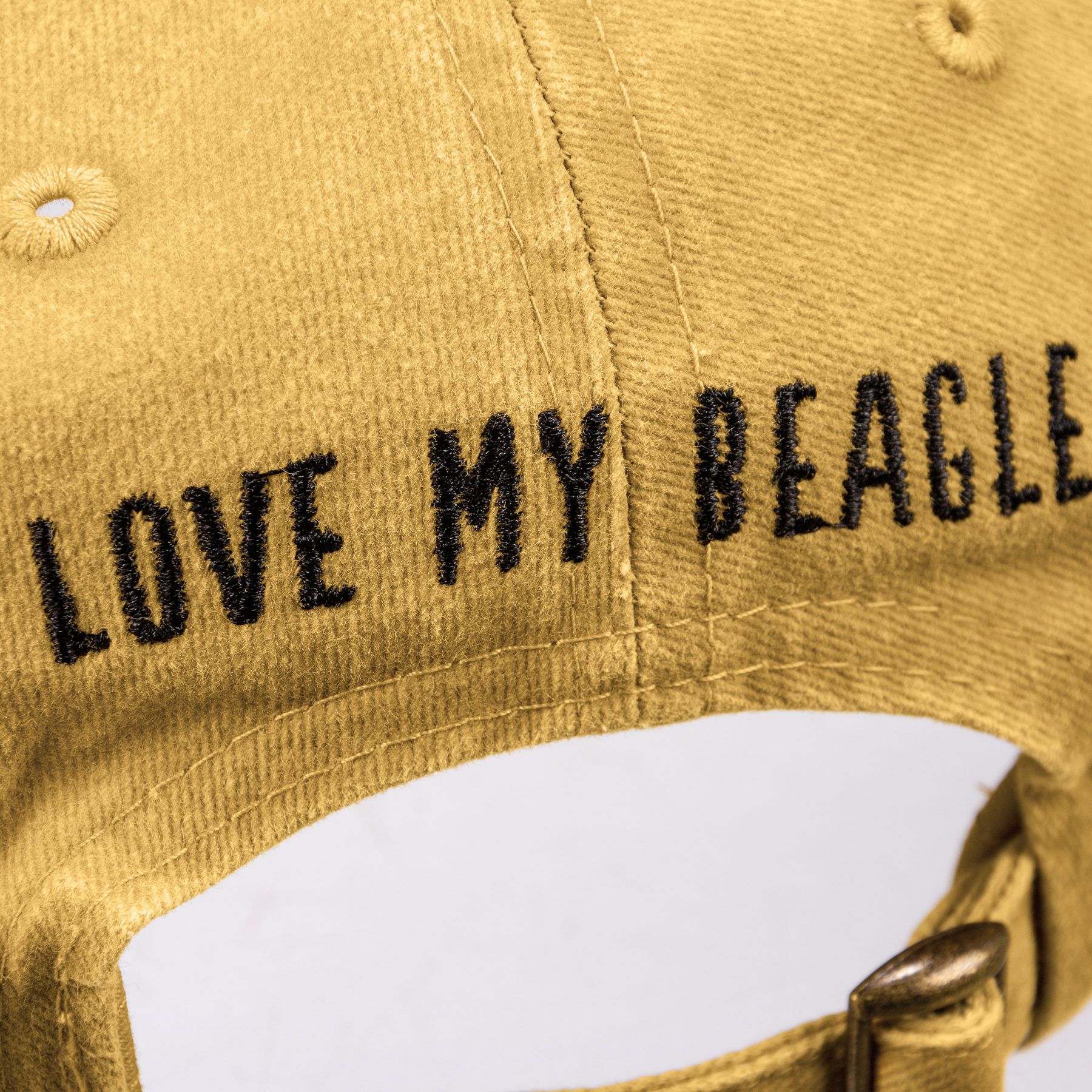 A cotton baseball cap from our Pet Collection with an adjustable brass closure. Features an embroidered beagle design on the front and "Love My Beagle" sentiment on the reverse side. Cap is one size fits most and hand-wash only. The Love My Beagle hat coordinates with our Best Beagle Ever Pet Bandana for matching dog and owner outfits.