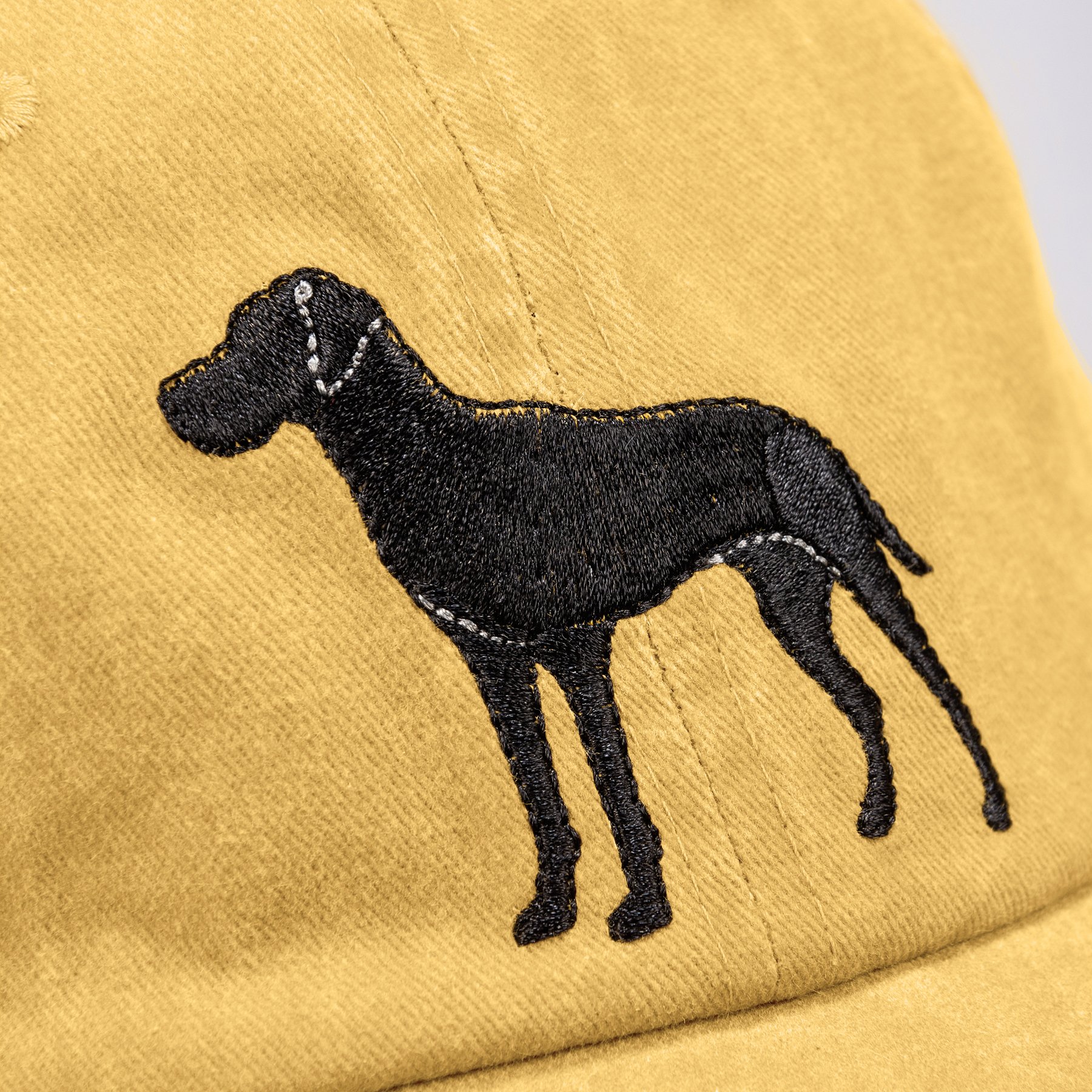 A cotton baseball cap from our Pet Collection with an adjustable brass closure. Features an embroidered great dane design on the front and "Love My Great Dane" sentiment on the reverse side. Cap is one size fits most and hand-wash only. The Love My Great Dane hat coordinates with our Best Great Dane Ever Pet Bandana for matching dog and owner outfits.