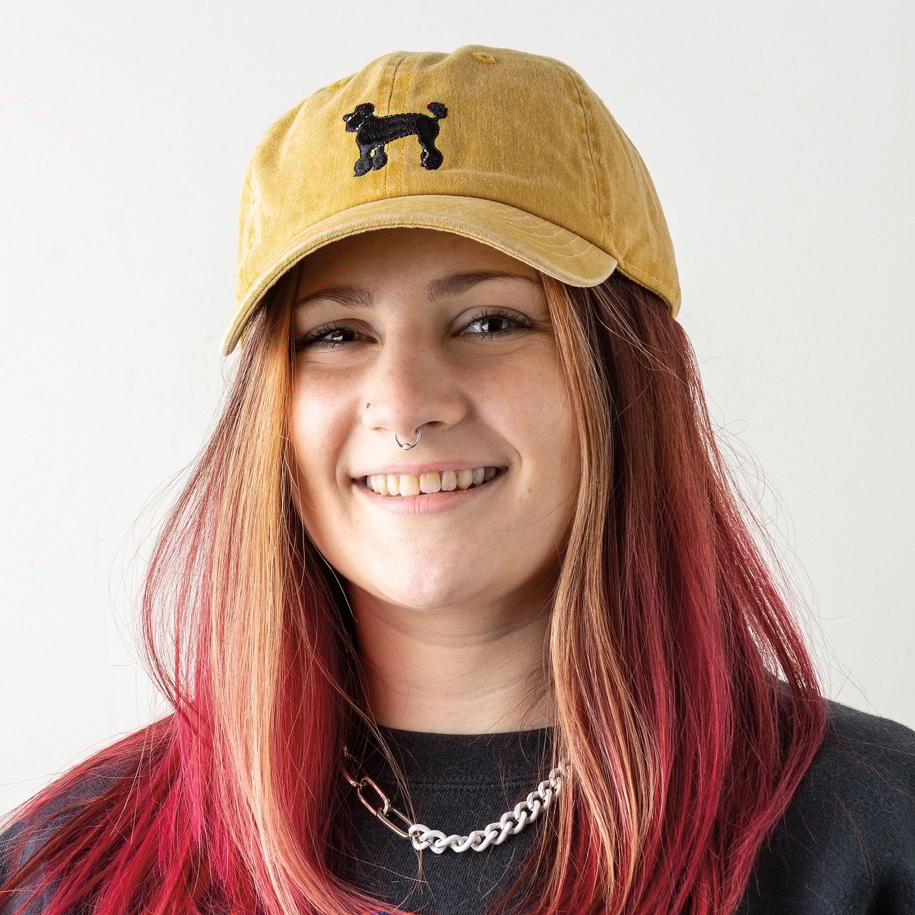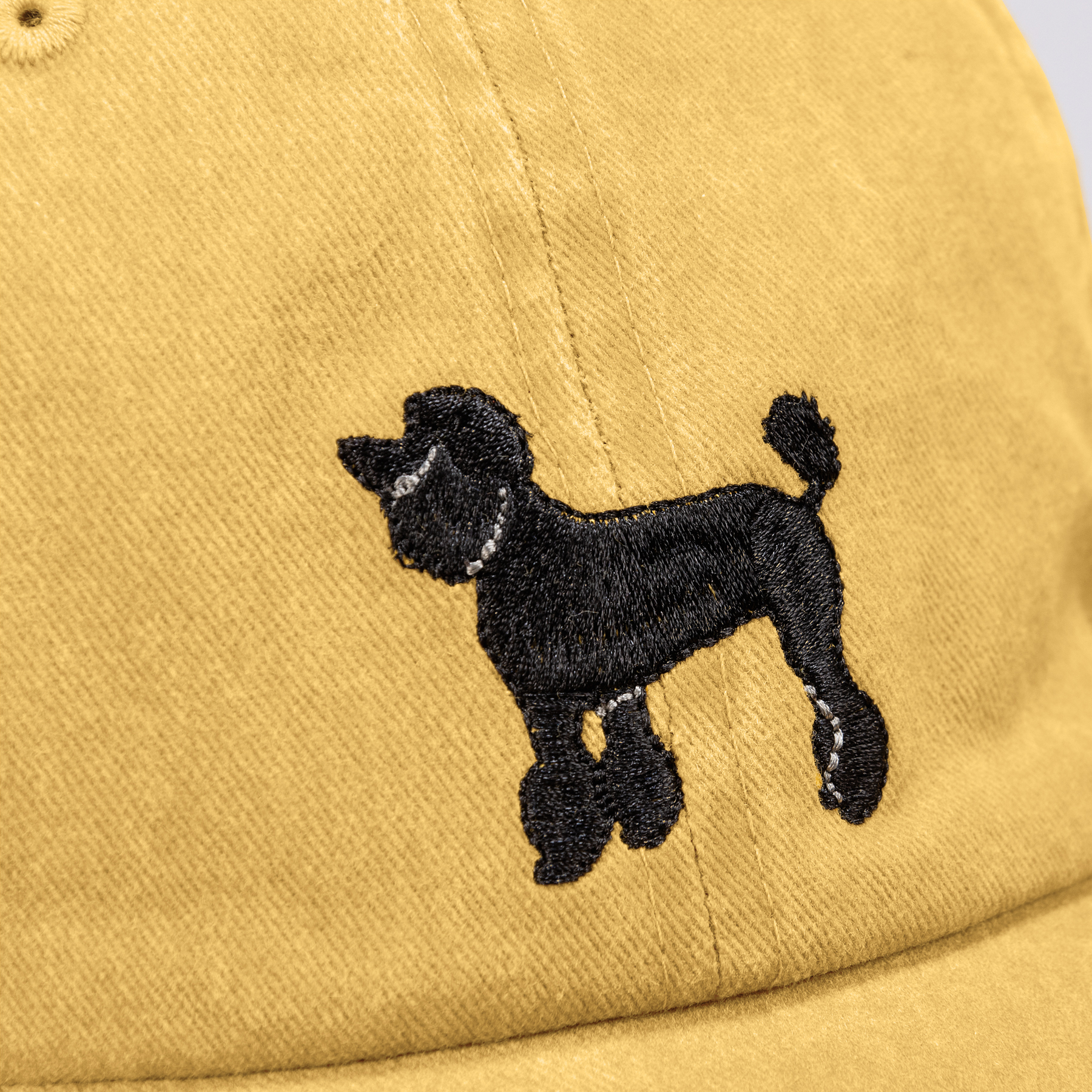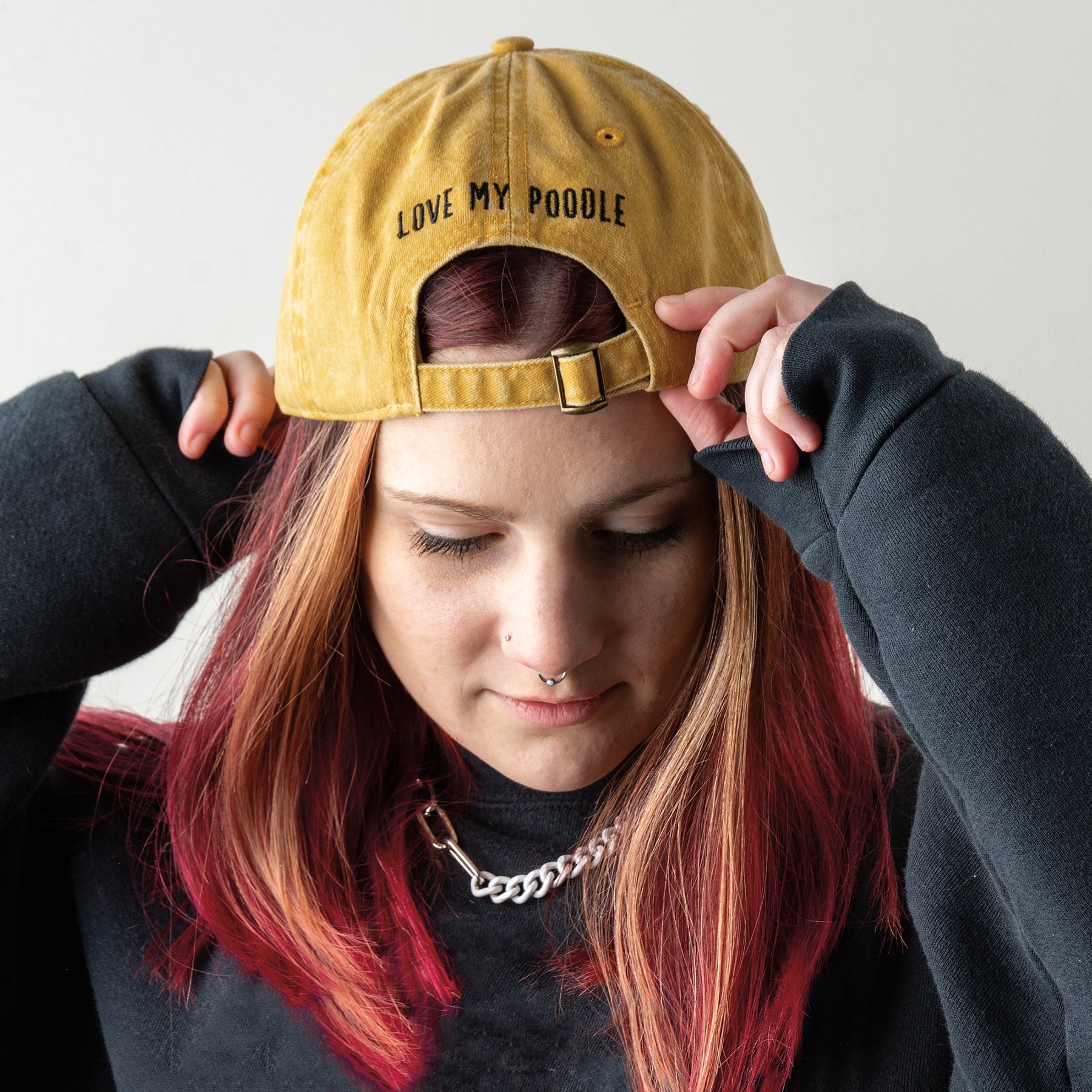 A cotton baseball cap from our Pet Collection with an adjustable brass closure. Features an embroidered poodle design on the front and "Love My Poodle" sentiment on the reverse side. Cap is one size fits most and hand-wash only. The Love My Poodle hat coordinates with our Best Poodle Ever Pet Bandana for matching dog and owner outfits.