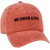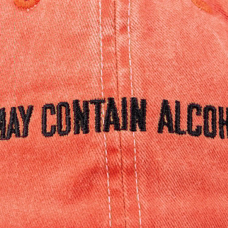 A cotton baseball cap from our Grilling & Chilling Collection comes with an adjustable brass closure on the back. Features a box sign style embroidered "May Contain Alcohol" sentiment in black onto a weathered orange base. Our May Contain Alcohol baseball hat is one size fits most. Hand-wash only.