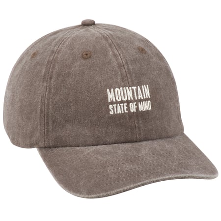 A stonewashed brown baseball cap from our Lake & Cabin Collection displaying a fun nature themed sentiment in a classic box sign style that reads "Mountain State Of Mind." This outdoor hat features a fully embroidered design for added detail. Our Mountain State Of Mind baseball cap is one size fits most with an adjustable metal buckle to create the perfect fit. Hand wash only. A fun nature themed gift perfect for an outdoor accessory.