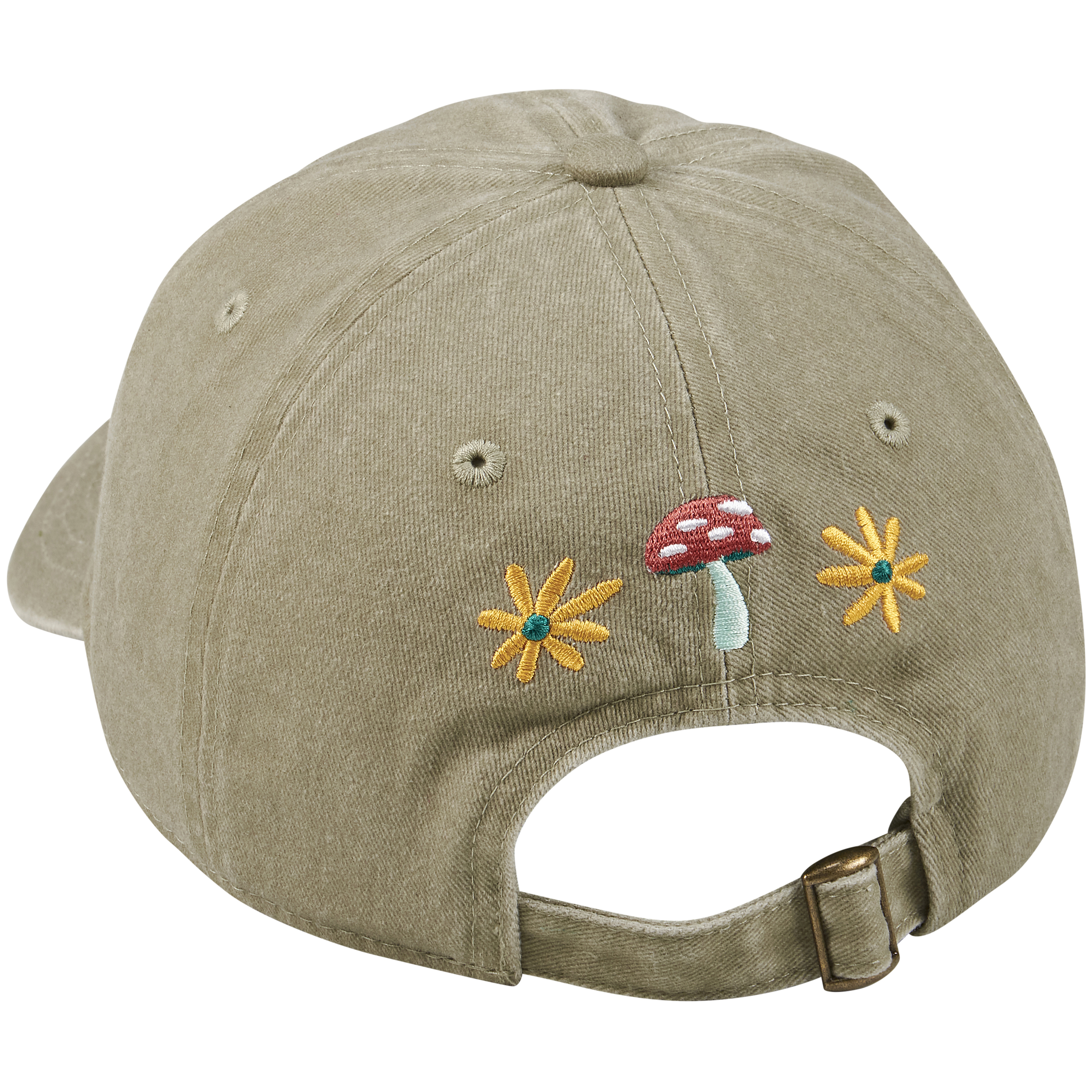 A tan baseball cap from our Inspiration & Blooms Collection displaying a vibrant design of a snail on mushrooms surrounded by flowers on the front with matching mushroom and flowers on the back. Baseball cap features fully embroidered designs for added detail. Our Mushroom baseball hat is one size fits most with an adjustable buckle closure to create the perfect fit. An inspirational accessory perfect for everyday wear. Hand wash only.
