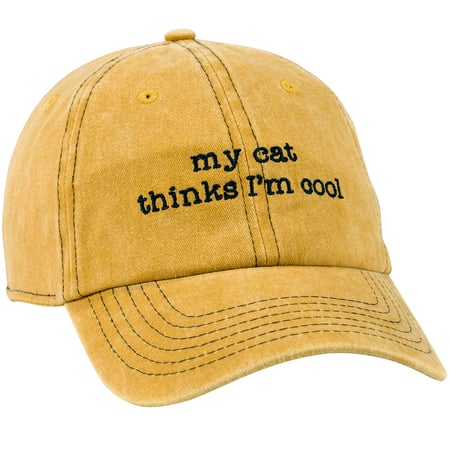A gold baseball cap from our Pet Collection displaying a playful "My Cat Thinks I'm Cool" sentiment with paw prints design on the back and black thread accents. Cap features embroidered sentiment and design for added detail. Our My Cat baseball cap is one size fits most with an adjustable buckle closure to create the perfect fit. A fun pet-themed accessory to wear for everyday use. Hand wash only.