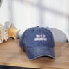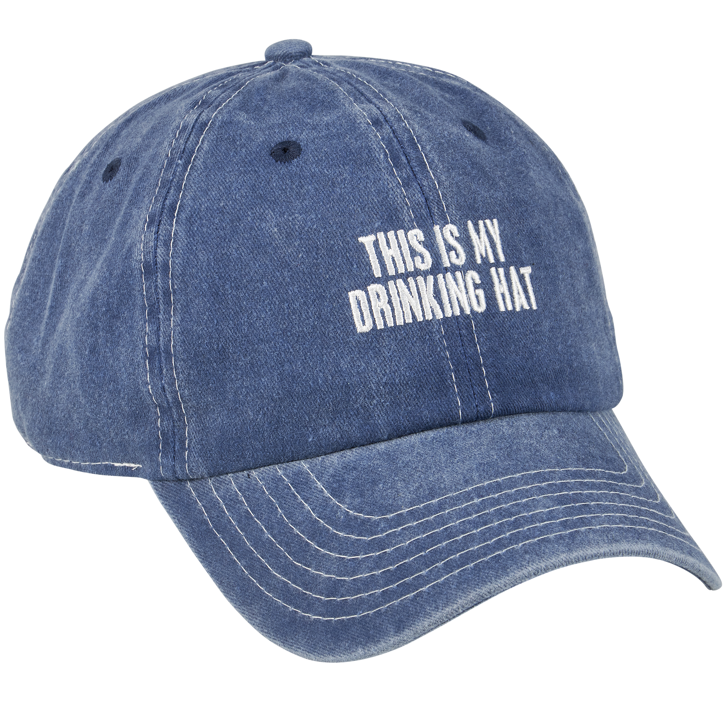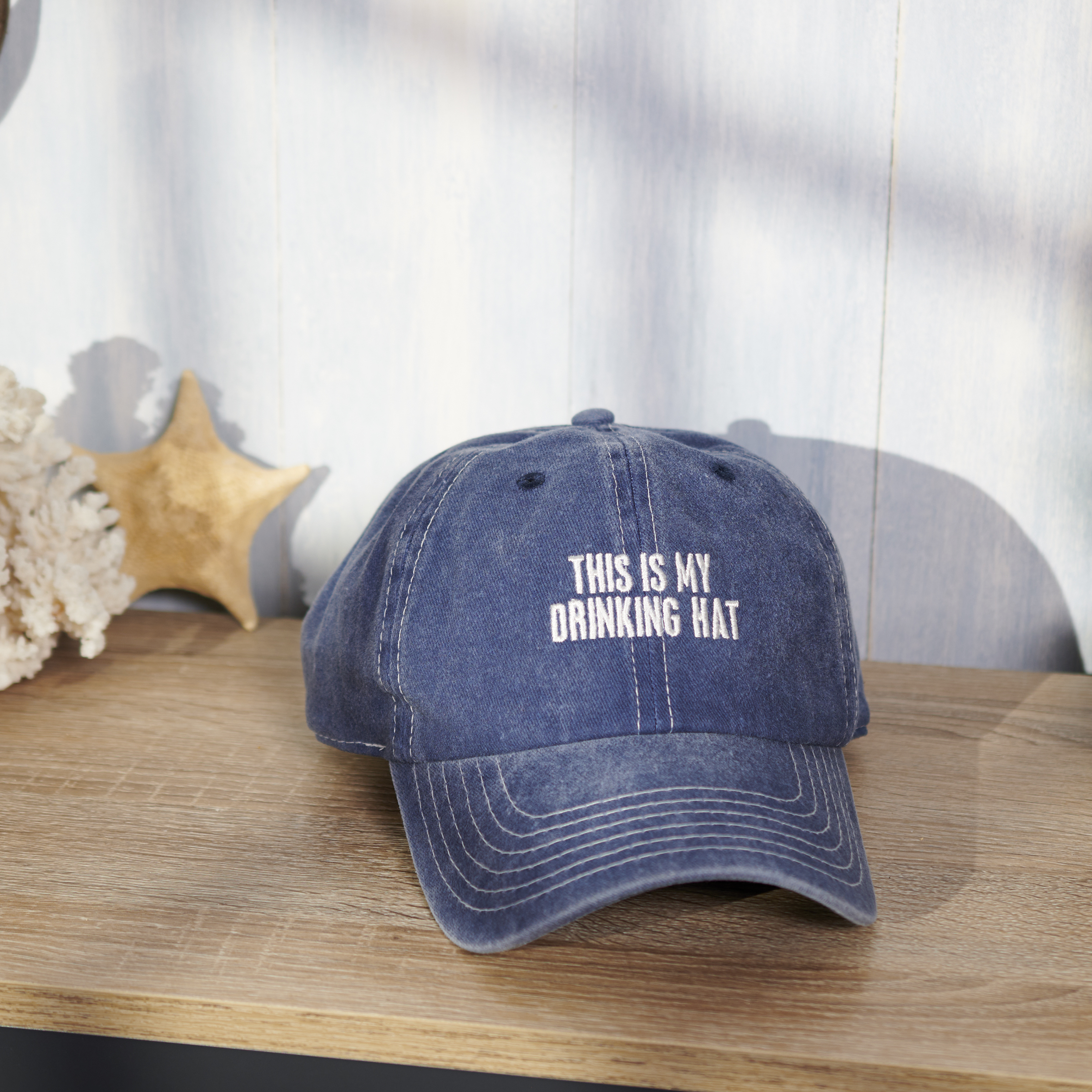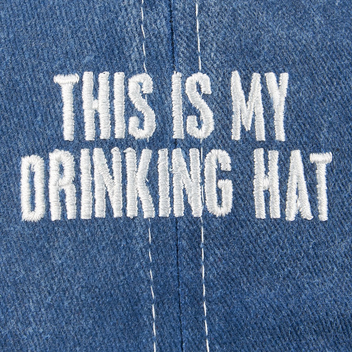 A stonewashed ocean blue baseball cap from our Beach Collection displaying a fun box sign style sentiment that reads "This Is My Drinking Hat." Cap features embroidered sentiment for added detail. Ou baseball cap is one size fits most with an adjustable buckle closure to create the perfect fit. A fun beach day accessory perfect for everyday use. Hand wash only.