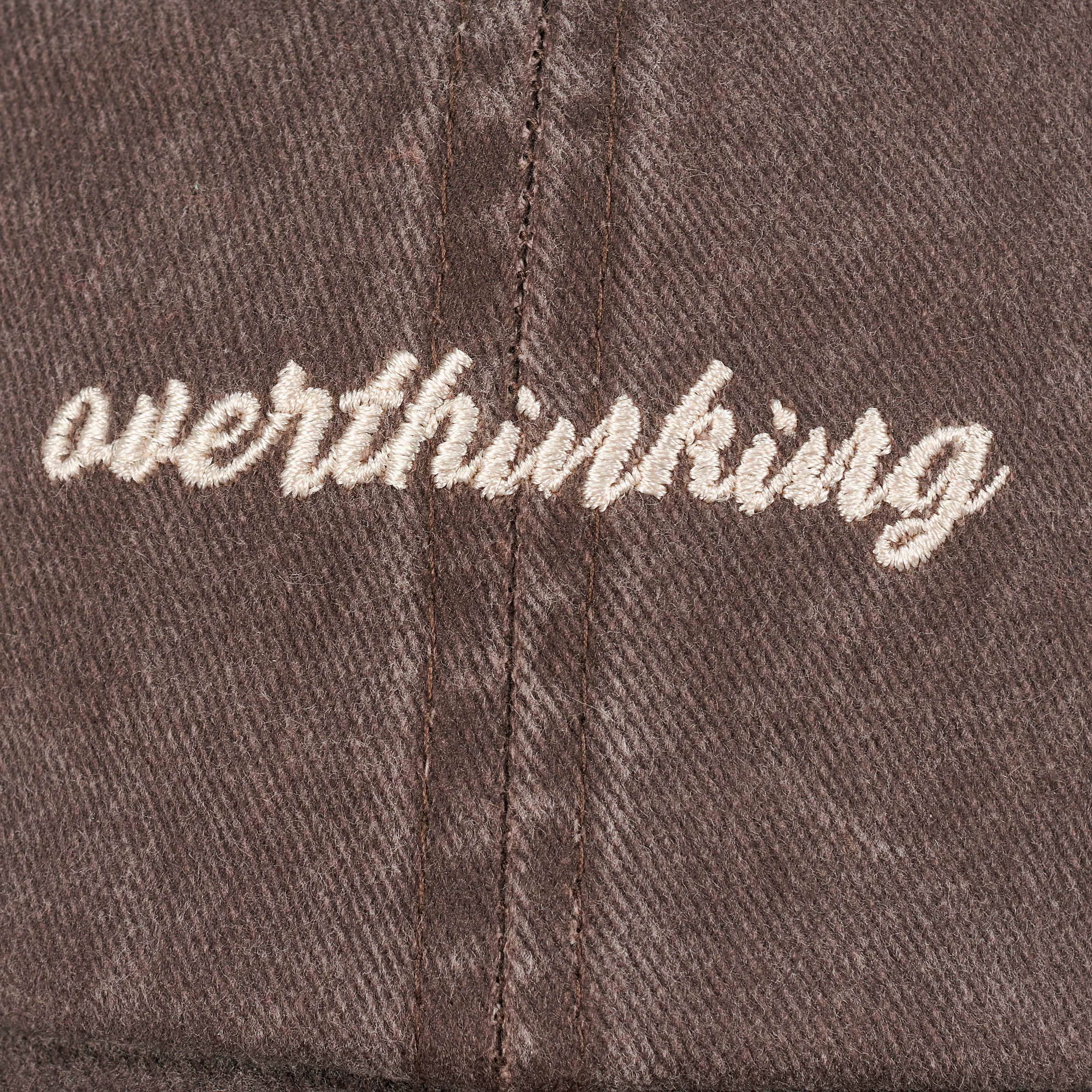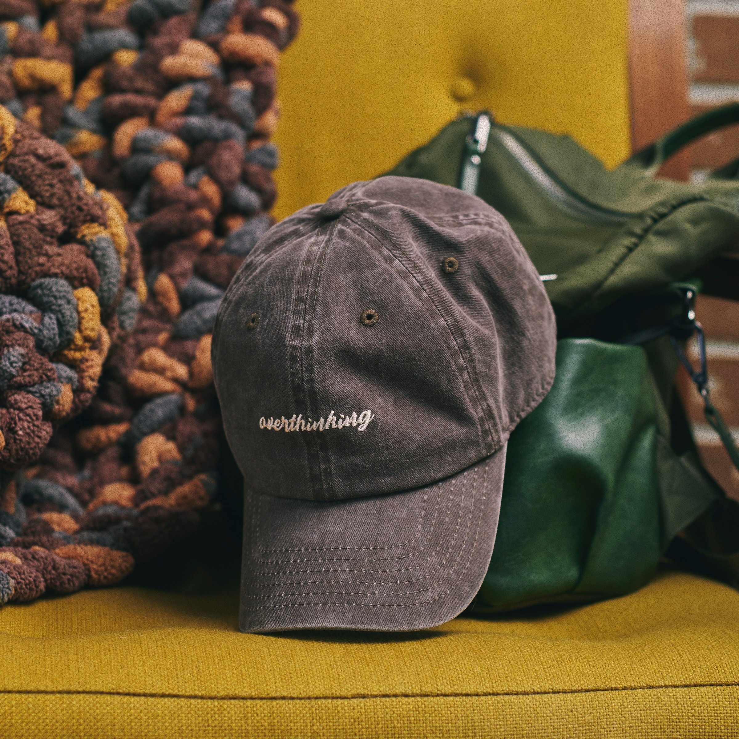 Give anyone that steps into personal space a vibe check with this stonewashed black baseball cap displaying a relatable sentiment that reads "Overthinking" in an earthy style. Design is fully embroidered on stonewashed cotton for a naturally worn look. Questionables baseball caps are one size fits most with an adjustable buckle closure to create the perfect fit. Hand wash only. Our Overthinking baseball cap is perfect for everyday expression.