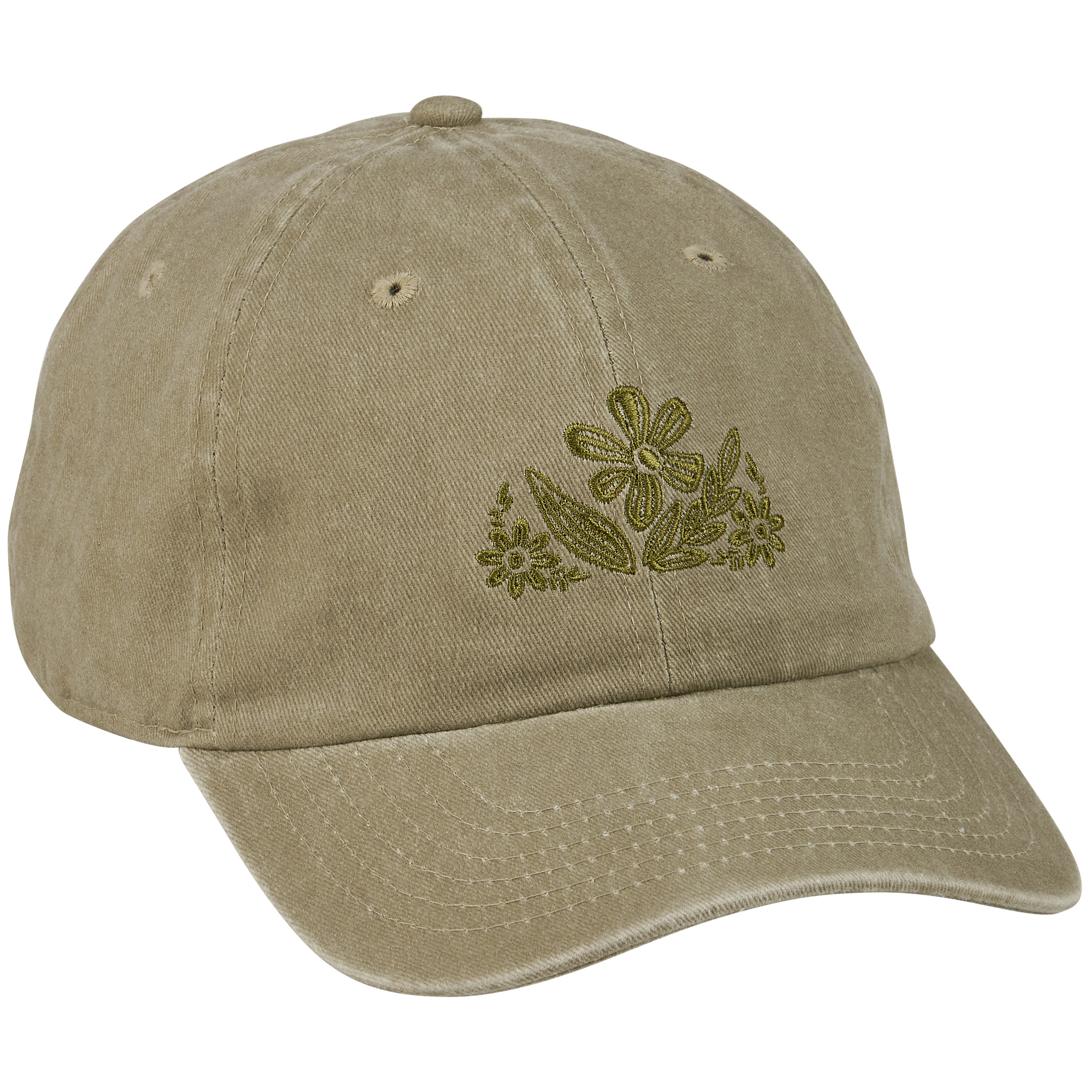 A tan baseball cap from our Folk Art Collection displaying a Scandinavian folk art inspired design of cosmos flowers in green color replicated from original hand illustrated art. Baseball cap features fully embroidered design for added detail. Our Peace Cosmos hat is one size fits most with an adjustable buckle closure to create the perfect fit. An inspirational accessory perfect for everyday wear. Hand wash only.