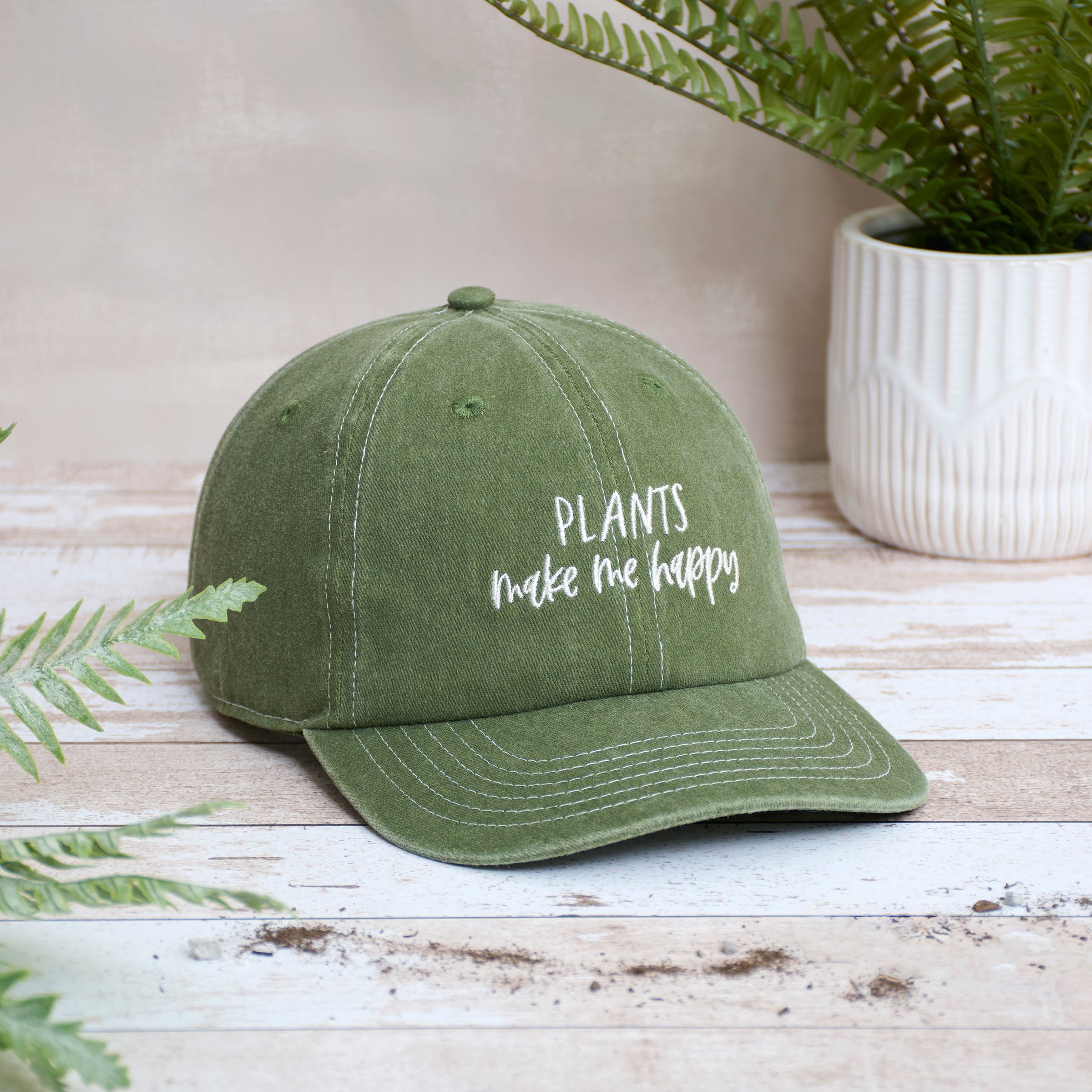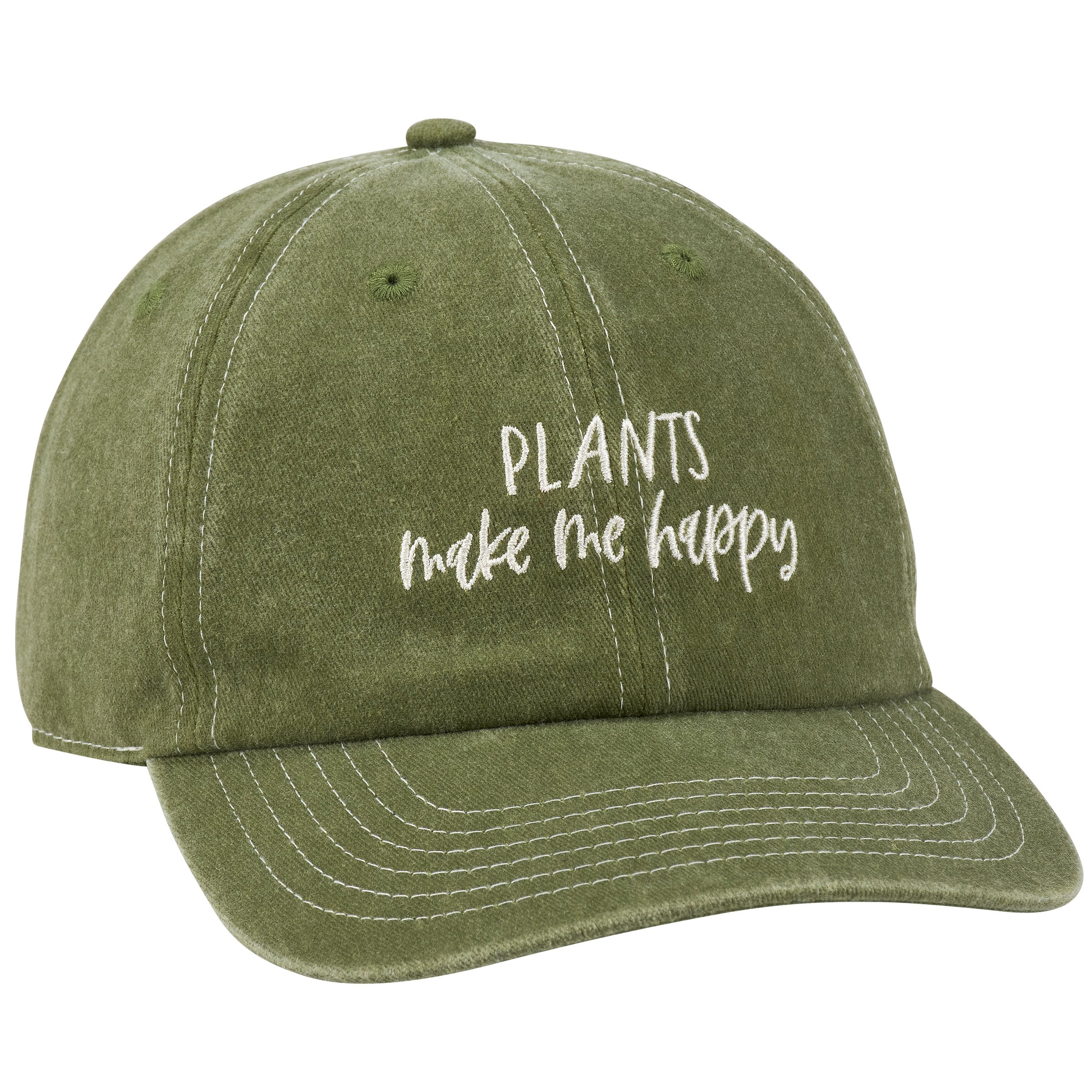A stonewashed green baseball cap from our Plant Parent Gift Collection displaying a fun plant themed sentiment in a handwritten style that reads "Plants Make Me Happy." This plant parent hat features a fully embroidered design for added detail. Our Plants Make Me Happy baseball cap is one size fits most with an adjustable metal buckle to create the perfect fit. Hand wash only. A fun gift for plant parents perfect for everyday style while showing off a love for house plants.