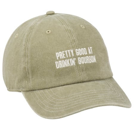 A stonewashed tan baseball cap from our Box Sign Style Collection displaying a funny alcohol themed sentiment in a classic box sign style that reads "Pretty Good At Drinkin' Bourbon." This funny drinking hat features a fully embroidered design for added detail. Our Good At Drinkin' Bourbon baseball cap is one size fits most with an adjustable metal buckle to create the perfect fit. Hand wash only. A fun alcohol themed gift perfect for an everyday accessory.