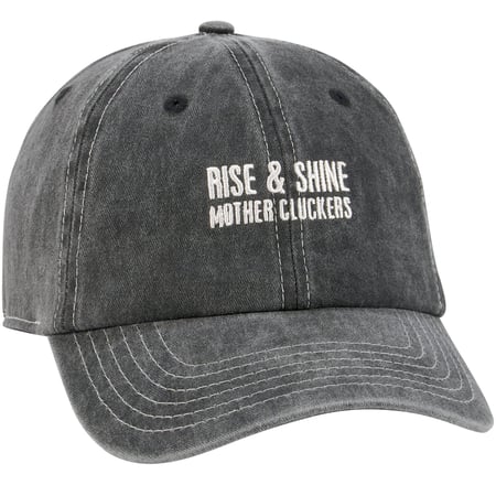 A stonewashed black baseball cap from our Farmhouse Collection displaying a humorous "Rise & Shine Mother Cluckers" sentiment with a rooster and chicken design on the back. Cap features embroidered sentiment and design for added detail. Our Rise & Shine baseball cap is one size fits most with an adjustable buckle closure to create the perfect fit. A stylish accessory option for daily activities. Hand wash only.